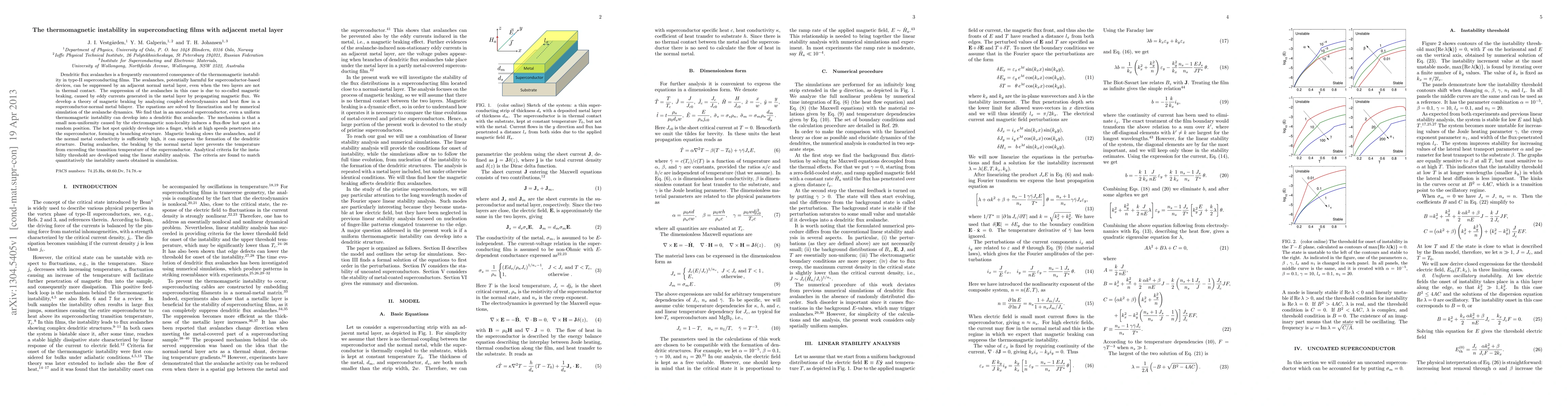 This paper investigates the thermomagnetic instability in superconducting films with an adjacent normal metal layer, demonstrating that dendritic flux avalanches can be suppressed by magnetic braking from eddy currents in the metal layer. The study develops a theoretical framework and finds that high conductivity in the metal layer can prevent the formation of dendritic structures and keep the superconductor's temperature below its transition temperature.