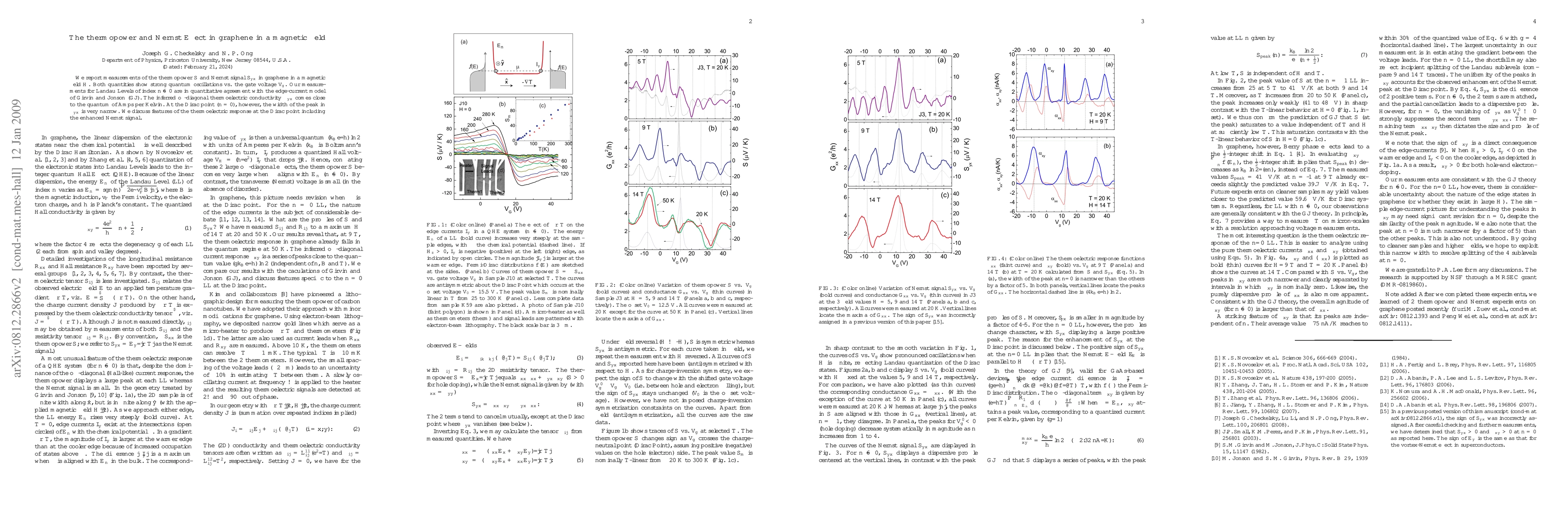 This paper reports on measurements of thermopower and the Nernst effect in graphene under a magnetic field, showing strong quantum oscillations. The results for non-zero Landau levels align with the edge-current model, while the thermoelectric response near the Dirac point exhibits a narrow peak and an enhanced Nernst signal.