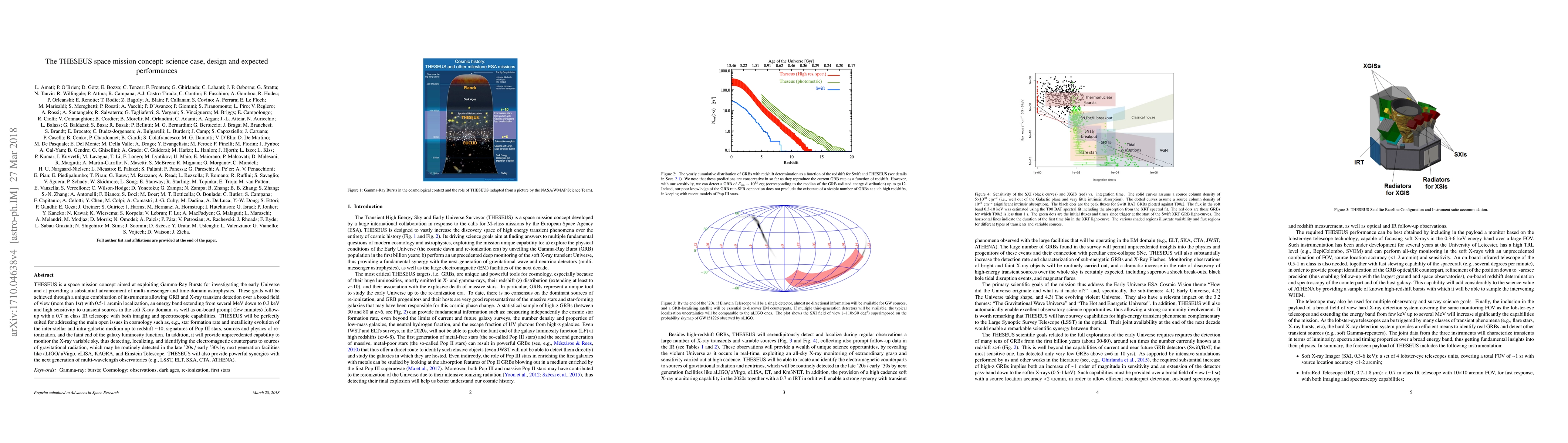 THESEUS is a proposed space mission designed to study Gamma-Ray Bursts and advance multi-messenger astrophysics, featuring a broad field of view, high sensitivity to transient X-ray sources, and on-board IR follow-up. It aims to address key cosmological questions and enhance monitoring of the X-ray variable sky.