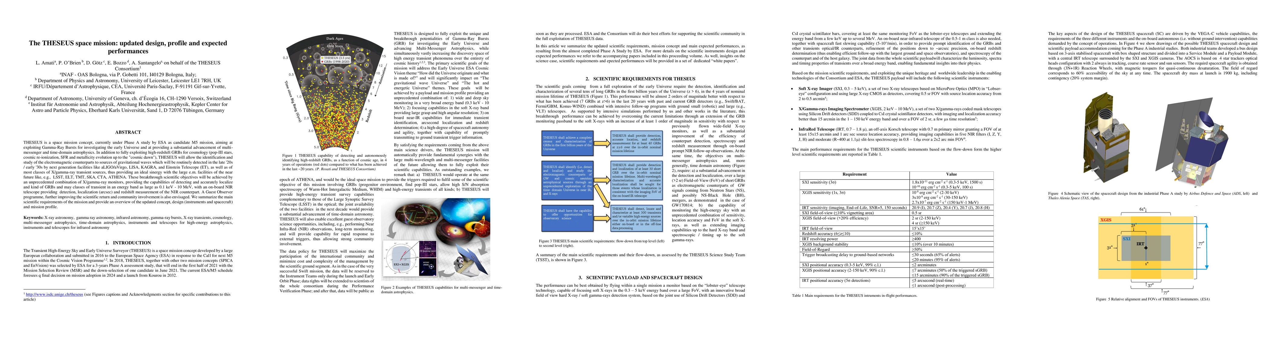 THESEUS is an ESA-proposed space mission designed to study Gamma-Ray Bursts and advance multi-messenger astrophysics, aiming to explore the early Universe and identify electromagnetic counterparts to gravitational waves. The mission features advanced X/gamma-ray monitors and an on-board NIR telescope for precise localization and redshift measurement.