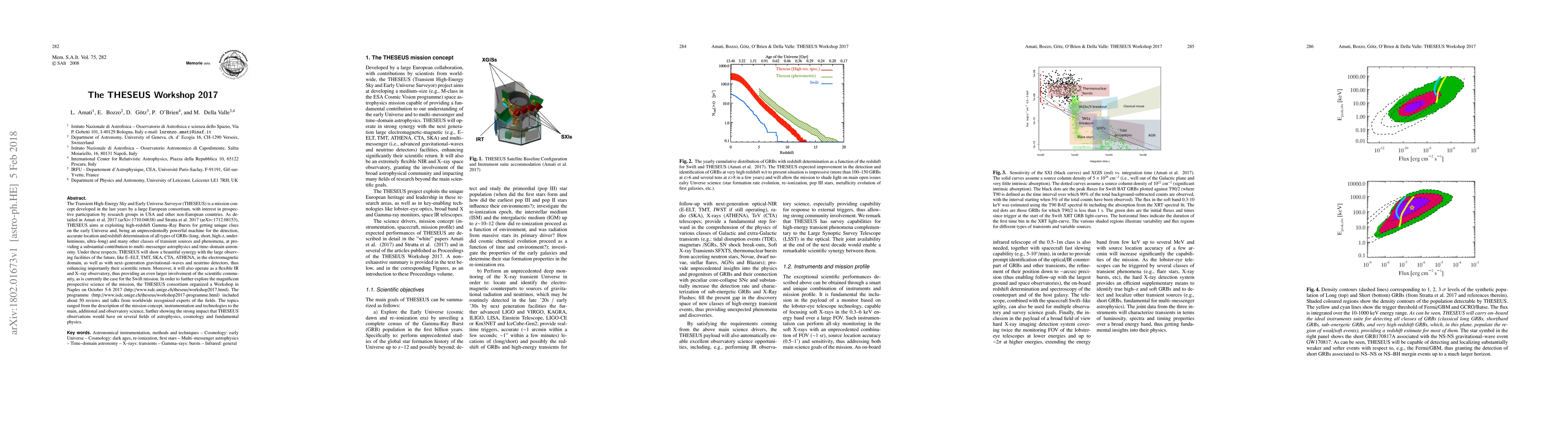 The THESEUS Workshop 2017 discussed the mission concept of the Transient High-Energy Sky and Early Universe Surveyor, focusing on its potential to detect and study gamma-ray bursts and other transient sources, thereby contributing significantly to multi-messenger astrophysics and time-domain astronomy. The workshop highlighted the synergy with future large observatories and detectors, emphasizing the mission's broad scientific impact.