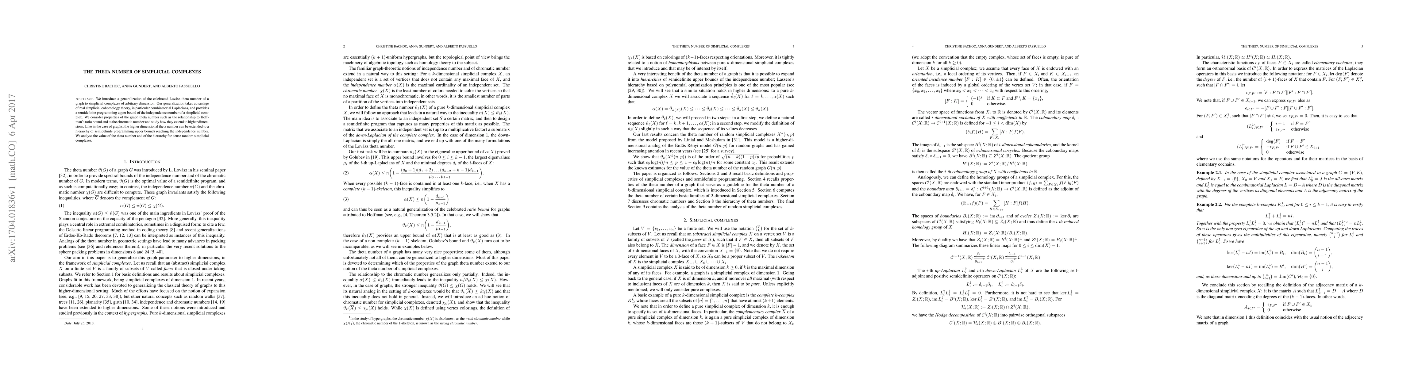 The paper presents a novel generalization of the Lovász theta number to simplicial complexes, along with a hierarchy of semidefinite programming relaxations for approximating the independence number.