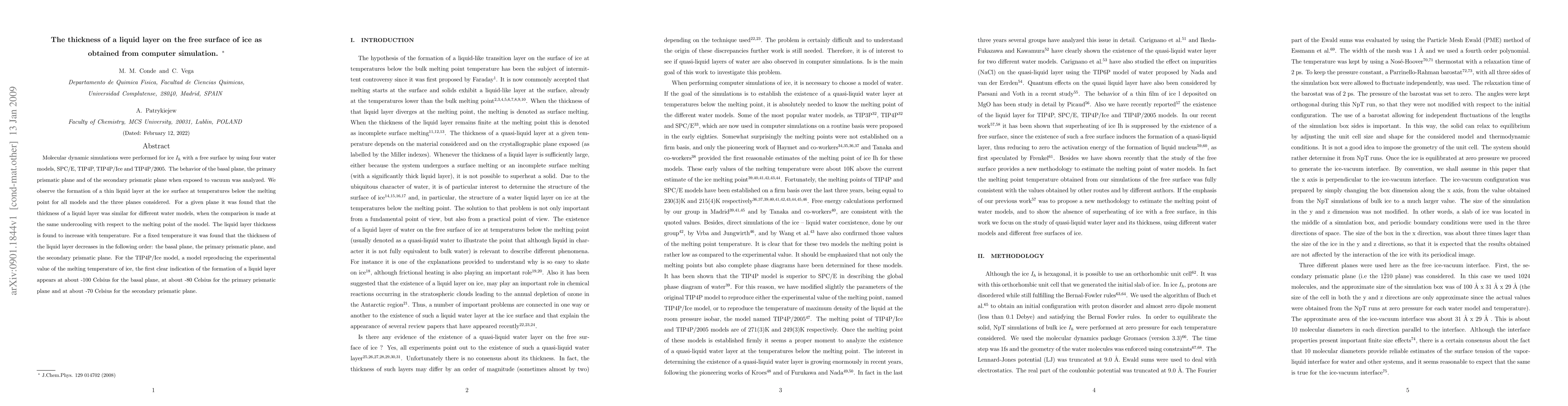 Molecular dynamic simulations reveal the formation of a thin liquid layer on the surface of ice below its melting point, with similar thickness across different water models at the same undercooling. The liquid layer's thickness decreases in the order of basal, primary prismatic, and secondary prismatic planes for a given temperature.