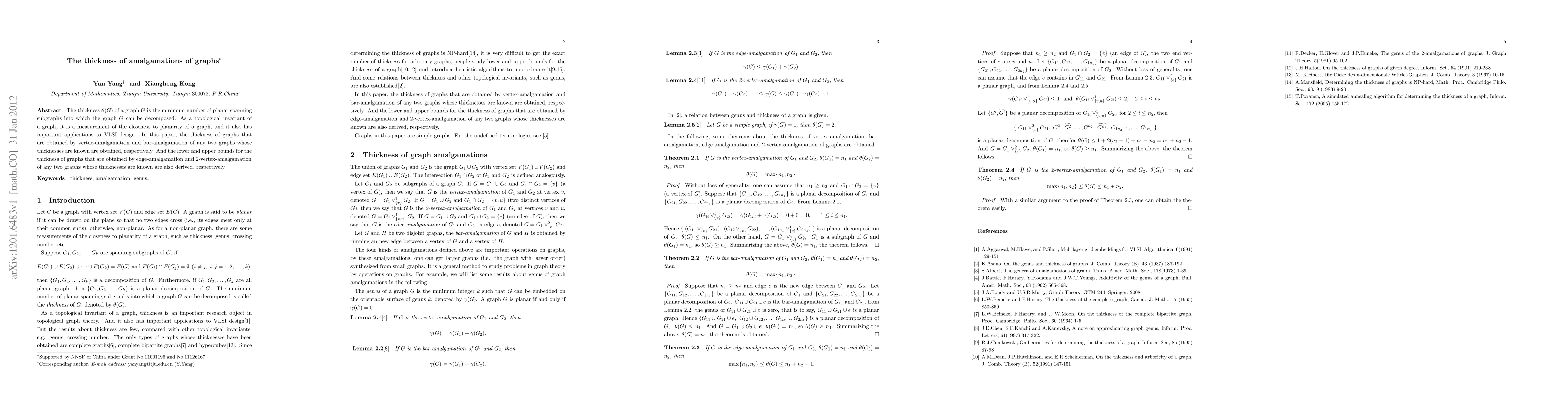The thickness $\theta(G)$ of a graph $G$ is the minimum number of planar spanning subgraphs into which the graph $G$ can be decomposed. As a topological invariant of a graph, it is a measurement of the closeness to planarity of a graph, and it also has important applications to VLSI design. In this paper, the thickness of graphs that are obtained by vertex-amalgamation and bar-amalgamation of any two graphs whose thicknesses are known are obtained, respectively. And the lower and upper bounds for the thickness of graphs that are obtained by edge-amalgamation and 2-vertex-amalgamation of any two graphs whose thicknesses are known are also derived, respectively.