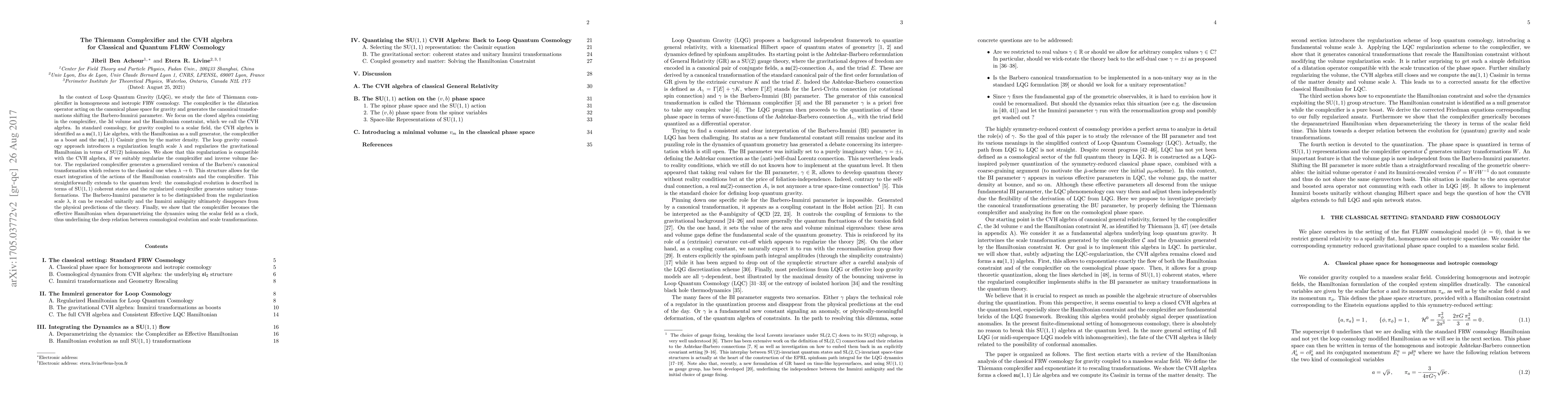 In the context of Loop Quantum Gravity (LQG), we study the fate of Thiemann complexifier in homogeneous and isotropic FRW cosmology. The complexifier is the dilatation operator acting on the canonical phase space for gravity and generates the canonical transformations shifting the Barbero-Immirzi parameter. We focus on the closed algebra consisting in the complexifier, the 3d volume and the Hamiltonian constraint, which we call the CVH algebra. In standard cosmology, for gravity coupled to a scalar field, the CVH algebra is identified as a su(1,1) Lie algebra, with the Hamiltonian as a null generator, the complexifier as a boost and the su(1,1) Casimir given by the matter density. The loop gravity cosmology approach introduces a regularization length scale $\lambda$ and regularizes the gravitational Hamiltonian in terms of SU(2) holonomies. We show that this regularization is compatible with the CVH algebra, if we suitably regularize the complexifier and inverse volume factor. The regularized complexifier generates a generalized version of the Barbero's canonical transformation which reduces to the classical one when $\lambda \rightarrow 0$. This structure allows for the exact integration of the actions of the Hamiltonian constraints and the complexifier. This straightforwardly extends to the quantum level: the cosmological evolution is described in terms of SU(1,1) coherent states and the regularized complexifier generates unitary transformations. The Barbero-Immirzi parameter is to be distinguished from the regularization scale $\lambda$, it can be rescaled unitarily and the Immirzi ambiguity ultimately disappears from the physical predictions of the theory. Finally, we show that the complexifier becomes the effective Hamiltonian when deparametrizing the dynamics using the scalar field as a clock, thus underlining the deep relation between cosmological evolution and scale