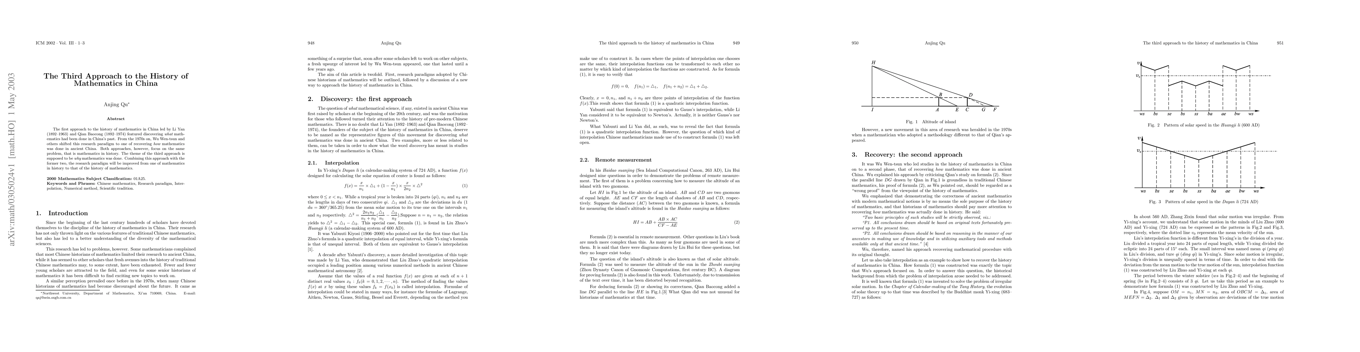 The first approach to the history of mathematics in China led by Li Yan (1892--1963) and Qian Baocong (1892--1974) featured discovering {\it what} mathematics had been done in China's past. From the 1970s on, Wu Wen-tsun and others shifted this research paradigm to one of recovering {\it how} mathematics was done in ancient China. Both approaches, however, focus on the same problem, that is mathematics in history. The theme of the third approach is supposed to be {\it why} mathematics was done. Combining this approach with the former two, the research paradigm will be improved from one of mathematics in history to that of the history of mathematics.