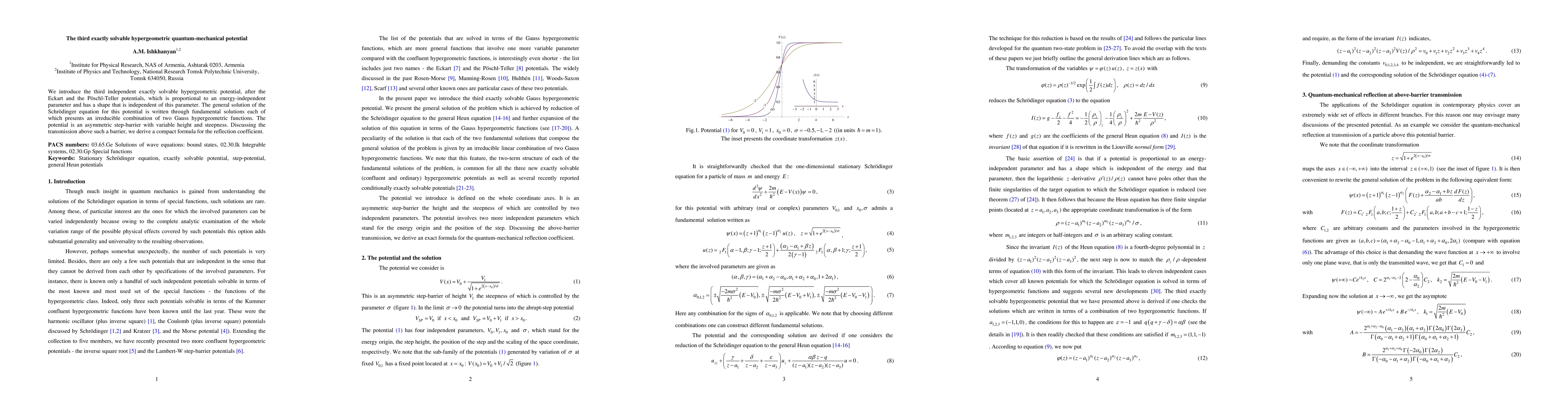 This paper introduces the third exactly solvable hypergeometric quantum-mechanical potential, distinct from the Eckart and P\"oschl-Teller potentials, and provides a solution through irreducible combinations of Gauss hypergeometric functions. The derived reflection coefficient formula aids in understanding transmission across its asymmetric step-barrier.