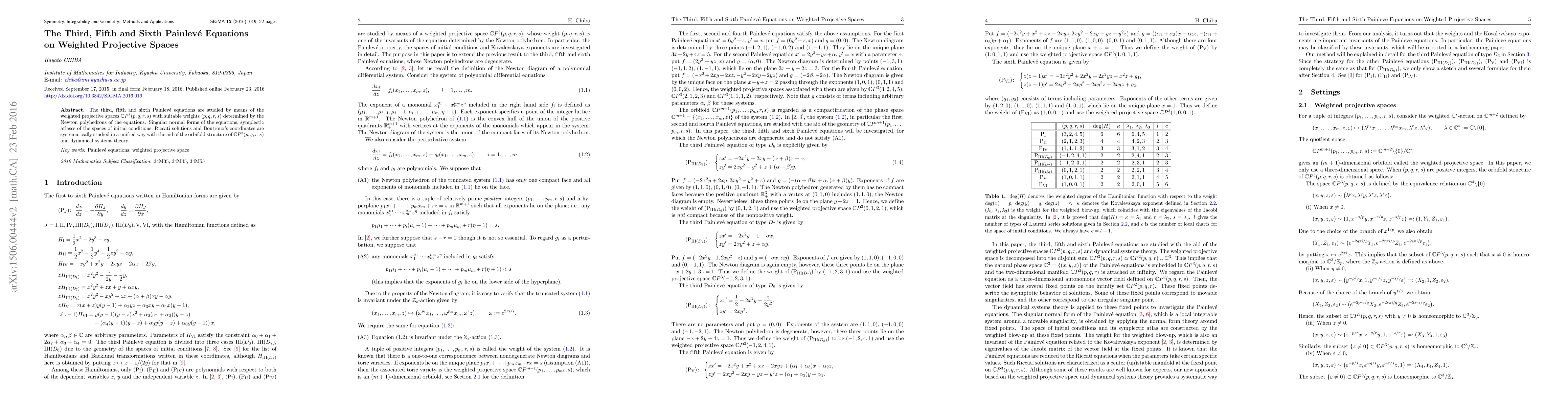 This paper investigates the third, fifth, and sixth Painlevé equations using weighted projective spaces ${\mathbb C}P^3(p,q,r,s)$, analyzing their singular normal forms, symplectic atlases, and Riccati solutions through the orbifold structure and dynamical systems theory.