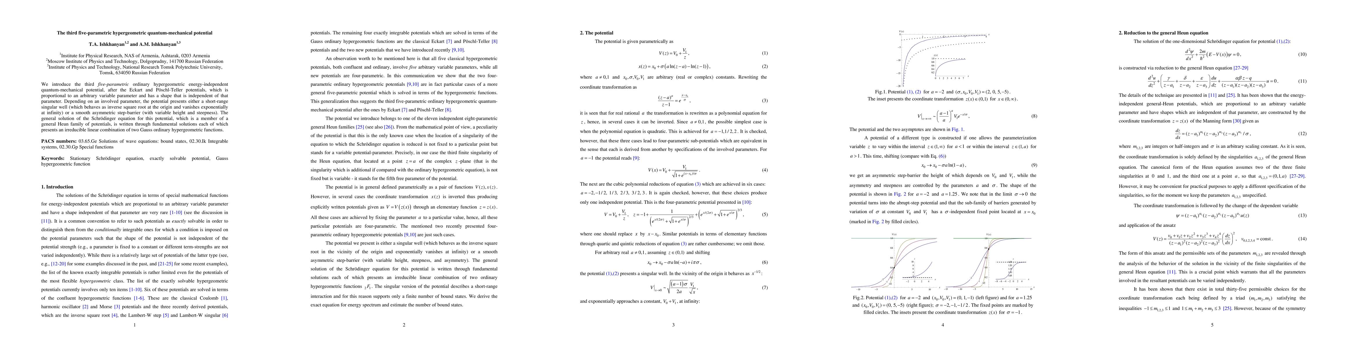 We introduce the third five-parametric ordinary hypergeometric energy-independent quantum-mechanical potential, after the Eckart and P\"oschl-Teller potentials, which is proportional to an arbitrary variable parameter and has a shape that is independent of that parameter. Depending on an involved parameter, the potential presents either a short-range singular well (which behaves as inverse square root at the origin and vanishes exponentially at infinity) or a smooth asymmetric step-barrier (with variable height and steepness). The general solution of the Schr\"odinger equation for this potential, which is a member of a general Heun family of potentials, is written through fundamental solutions each of which presents an irreducible linear combination of two Gauss ordinary hypergeometric functions.