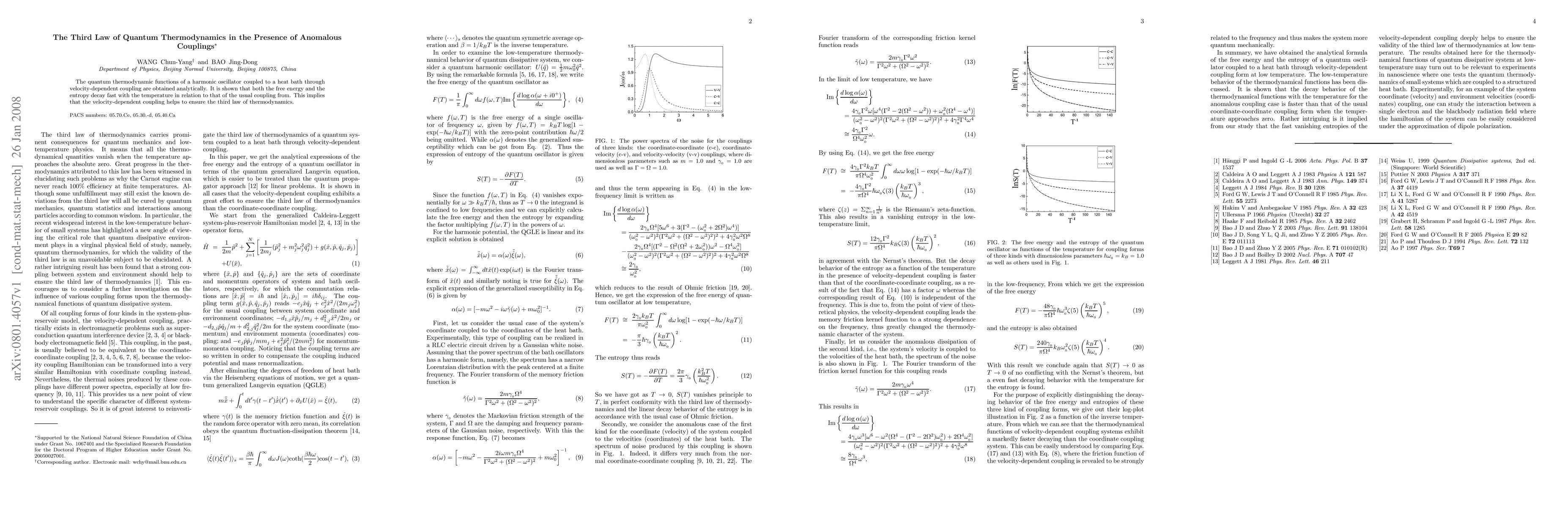 Summary: This paper analytically derives quantum thermodynamic functions for a harmonic oscillator with velocity-dependent coupling, demonstrating that such coupling accelerates the decay of free energy and entropy with temperature, thereby supporting the third law of thermodynamics.
