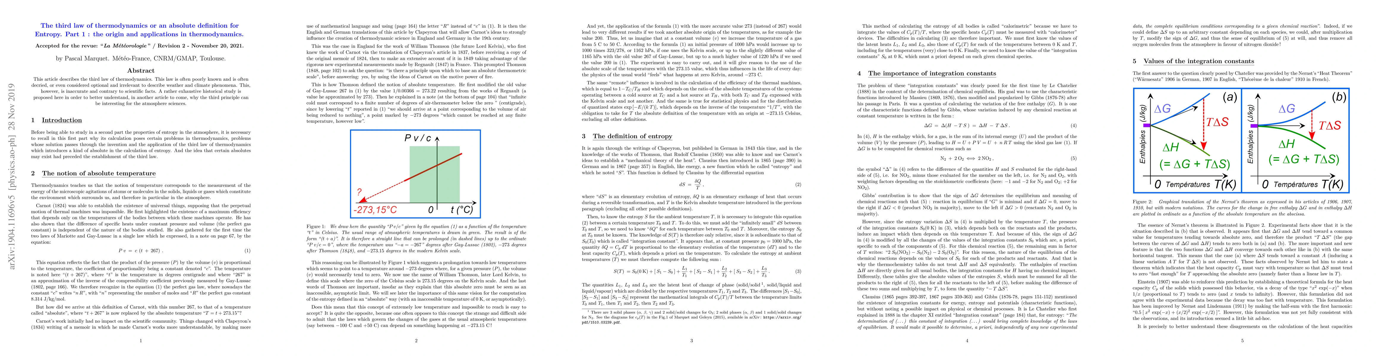 This article describes the third law of thermodynamics. This law is often poorly known and is often decried, or even considered optional and irrelevant to describe weather and climate phenomena. This, however, is inaccurate and contrary to scientific facts. A rather exhaustive historical study is proposed here in order to better understand, in another article to come, why the third principle can be interesting for the atmosphere sciences.