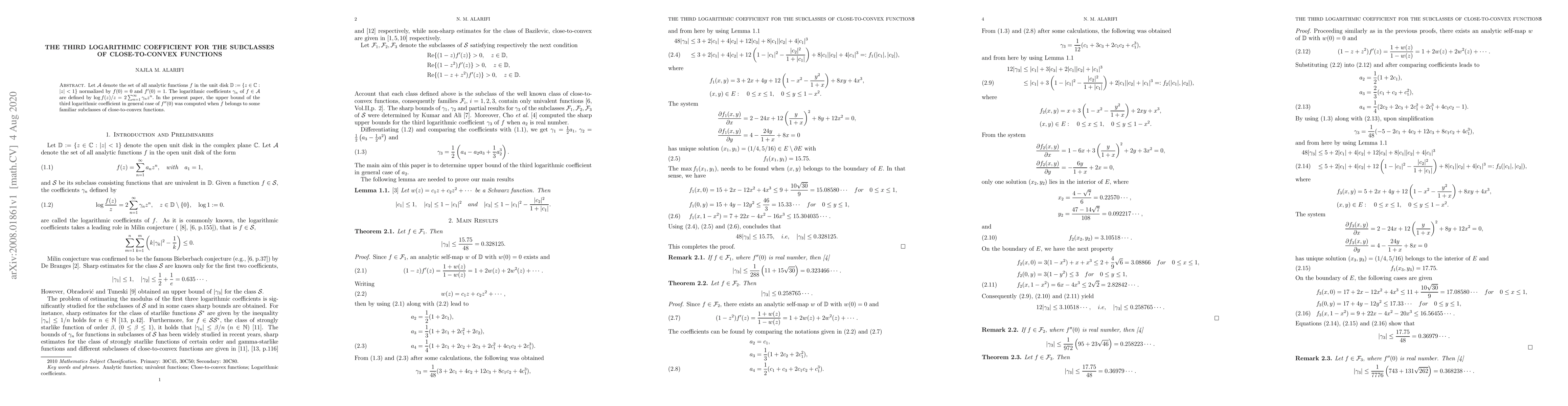 This paper investigates the upper bound of the third logarithmic coefficient for analytic functions in the unit disk that belong to certain subclasses of close-to-convex functions, providing a detailed analysis of the relationship between these coefficients and the second derivative at the origin.