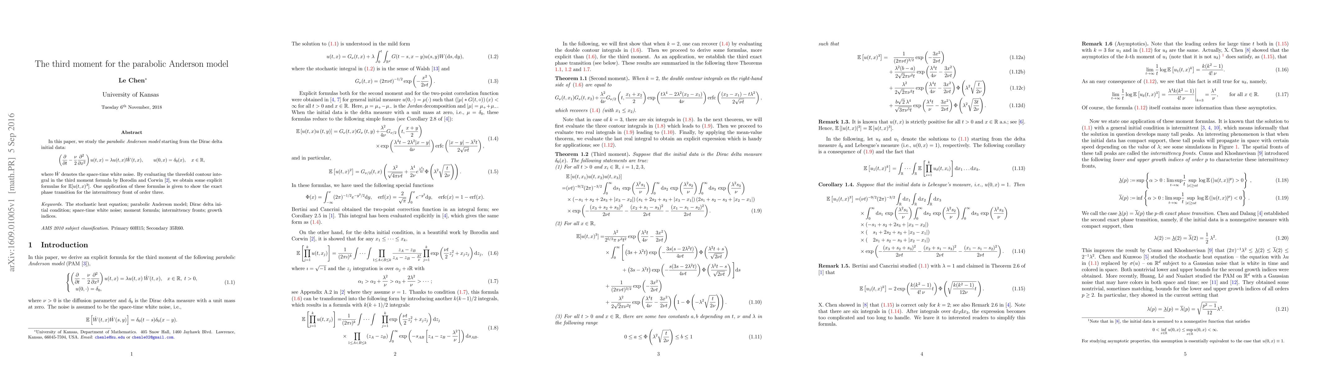 In this paper, we study the {\it parabolic Anderson model} starting from the Dirac delta initial data: \[ \left(\frac{\partial}{\partial t} -\frac{\nu}{2}\frac{\partial^2}{\partial x^2} \right) u(t,x) = \lambda u(t,x) \dot{W}(t,x), \qquad u(0,x)=\delta_0(x), \quad x\in\mathbb{R}, \] where $\dot{W}$ denotes the space-time white noise. By evaluating the threefold contour integral in the third moment formula by Borodin and Corwin [2], we obtain some explicit formulas for $\mathbb{E}[u(t,x)^3]$. One application of these formulas is given to show the exact phase transition for the intermittency front of order three.