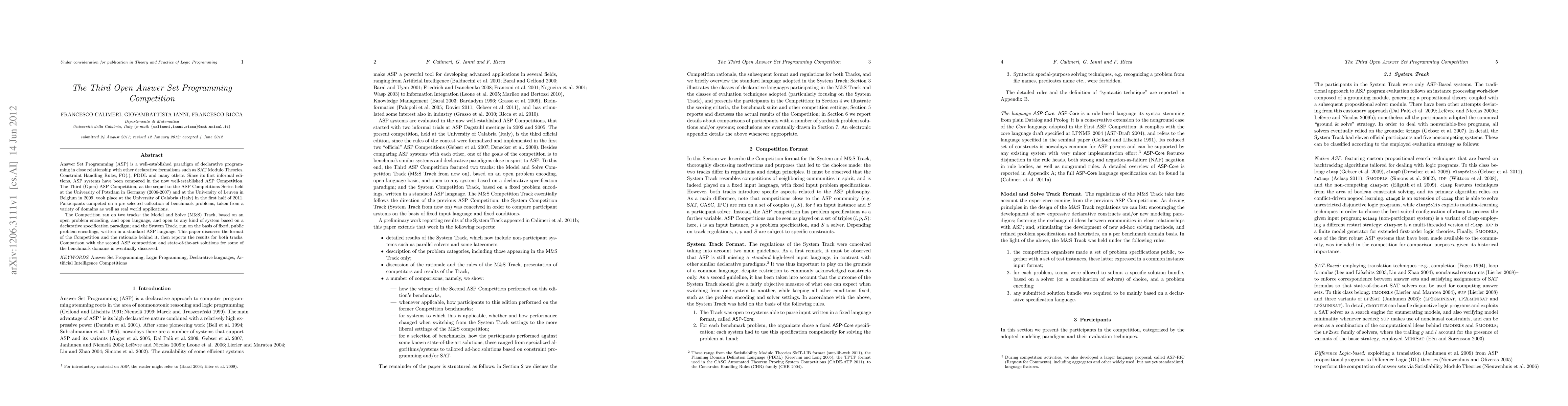 Answer Set Programming (ASP) is a well-established paradigm of declarative programming in close relationship with other declarative formalisms such as SAT Modulo Theories, Constraint Handling Rules, FO(.), PDDL and many others. Since its first informal editions, ASP systems have been compared in the now well-established ASP Competition. The Third (Open) ASP Competition, as the sequel to the ASP Competitions Series held at the University of Potsdam in Germany (2006-2007) and at the University of Leuven in Belgium in 2009, took place at the University of Calabria (Italy) in the first half of 2011. Participants competed on a pre-selected collection of benchmark problems, taken from a variety of domains as well as real world applications. The Competition ran on two tracks: the Model and Solve (M&S) Track, based on an open problem encoding, and open language, and open to any kind of system based on a declarative specification paradigm; and the System Track, run on the basis of fixed, public problem encodings, written in a standard ASP language. This paper discusses the format of the Competition and the rationale behind it, then reports the results for both tracks. Comparison with the second ASP competition and state-of-the-art solutions for some of the benchmark domains is eventually discussed. To appear in Theory and Practice of Logic Programming (TPLP).