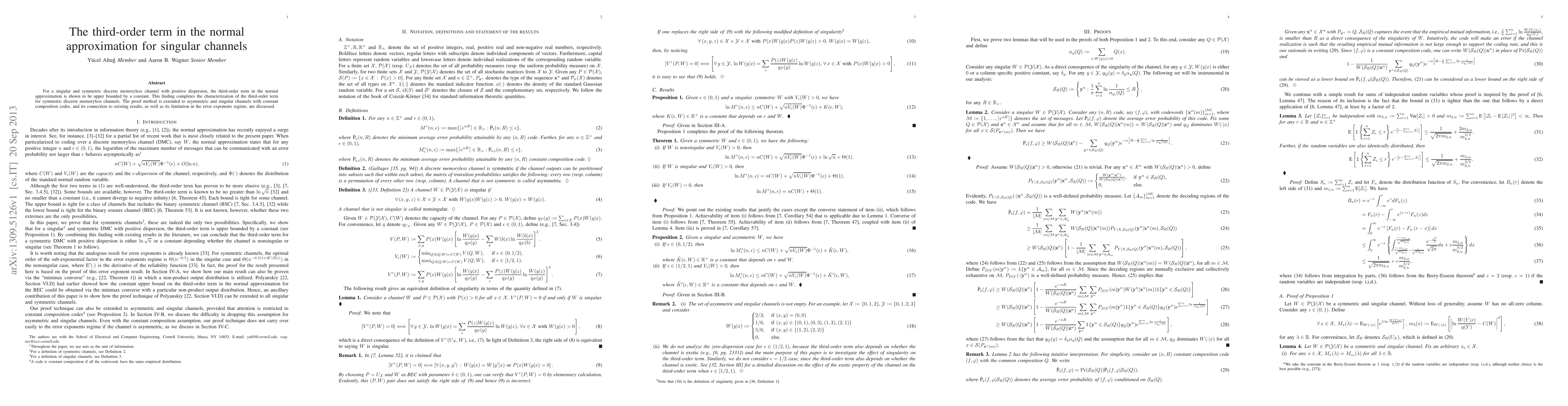 For a singular and symmetric discrete memoryless channel with positive dispersion, the third-order term in the normal approximation is shown to be upper bounded by a constant. This finding completes the characterization of the third-order term for symmetric discrete memoryless channels. The proof method is extended to asymmetric and singular channels with constant composition codes, and its connection to existing results, as well as its limitation in the error exponents regime, are discussed.