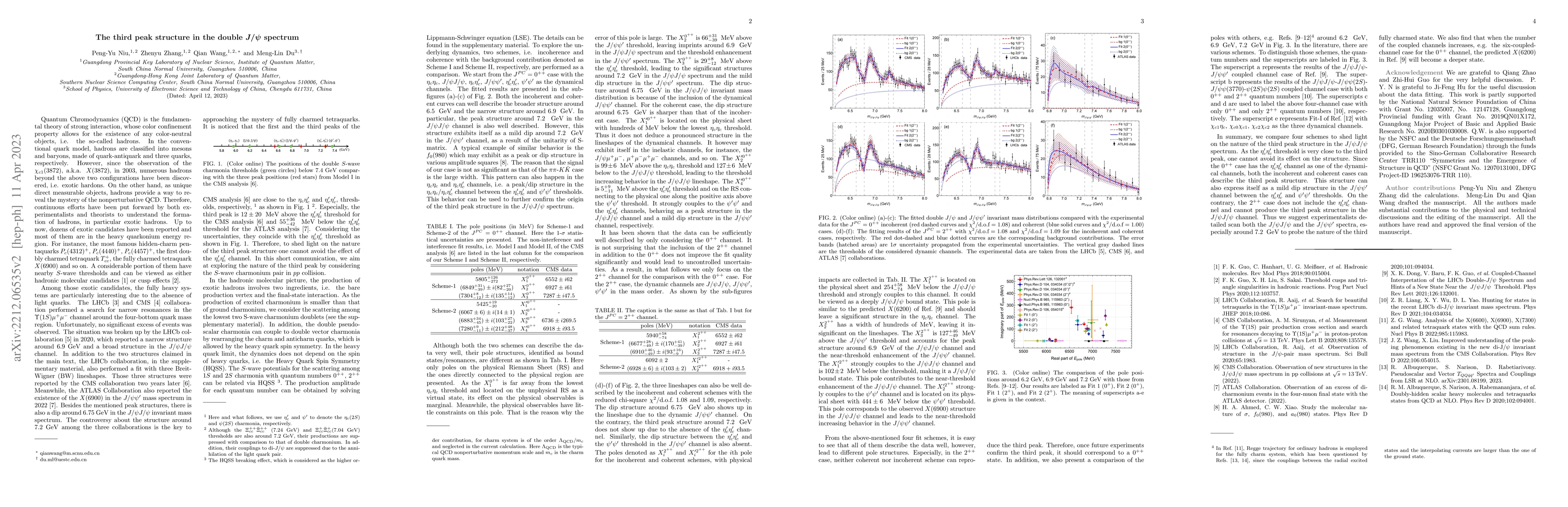 This paper investigates the third peak structure in the double $J/\psi$ spectrum, suggesting the role of the $\eta_c(2S)\eta_c(2S)$ channel near $7.2~\gev$ in the $J/\psi J/\psi$ and $J/\psi \psi^\prime$ invariant mass distributions. The study finds that different quantum numbers ($J^{PC}=0^{++}$ or $2^{++}$) lead to distinct pole structures and the number of poles is case-dependent, influencing the observed peak structure.