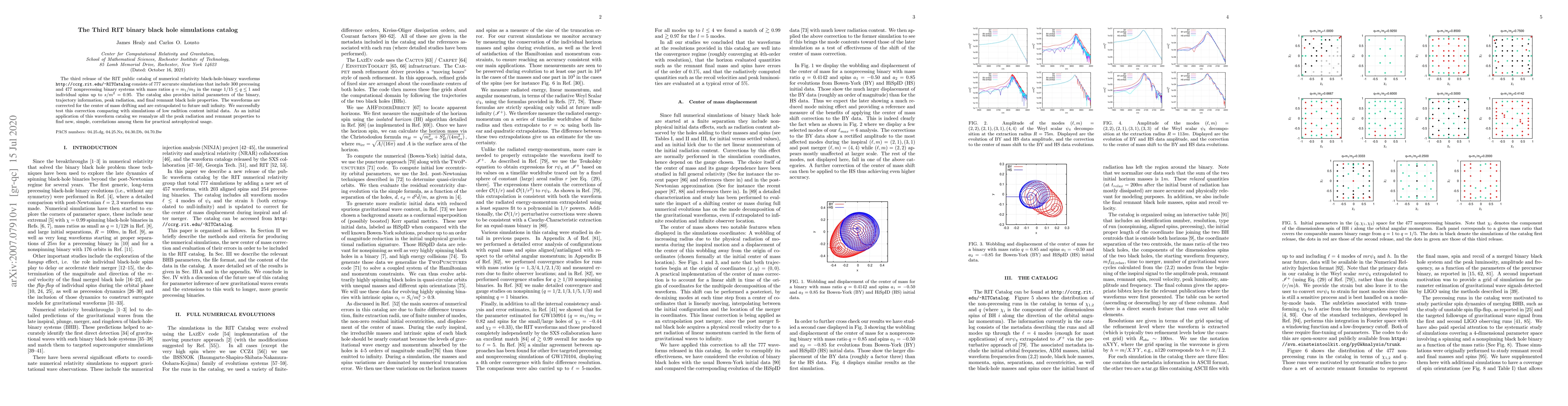 The third release of the RIT public catalog of numerical relativity black-hole-binary waveforms \url{http://ccrg.rit.edu/~RITCatalog} consists of 777 accurate simulations that include 300 precessing and 477 nonprecessing binary systems with mass ratios $q=m_1/m_2$ in the range $1/15\leq q\leq1$ and individual spins up to $s/m^2=0.95$. The catalog also provides initial parameters of the binary, trajectory information, peak radiation, and final remnant black hole properties. The waveforms are corrected for the center of mass drifting and are extrapolated to future null infinity. We successfully test this correction comparing with simulations of low radition content initial data. As an initial application of this waveform catalog we reanalyze all the peak radiation and remnant properties to find new, simple, correlations among them for practical astrophysical usage.