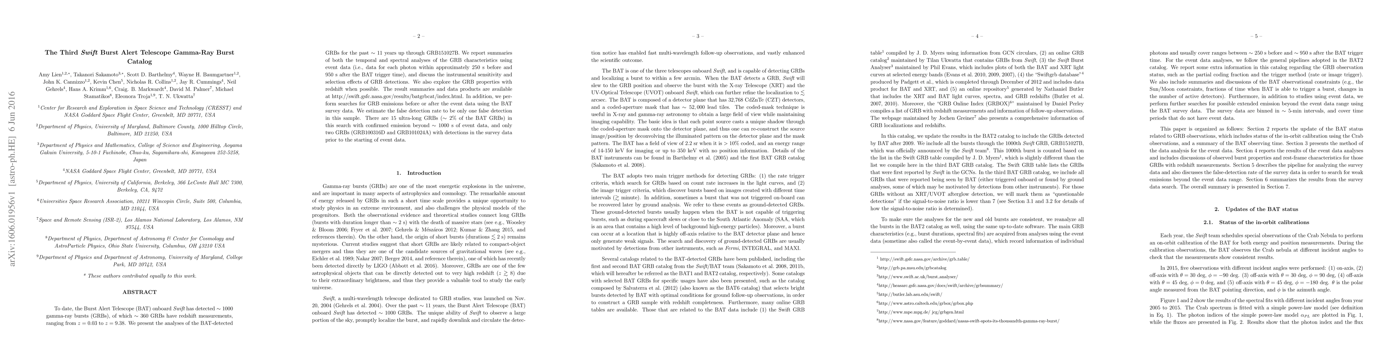 To date, the Burst Alert Telescope (BAT) onboard Swift has detected ~ 1000 gamma-ray bursts (GRBs), of which ~ 360 GRBs have redshift measurements, ranging from z = 0.03 to z = 9.38. We present the analyses of the BAT-detected GRBs for the past ~ 11 years up through GRB151027B. We report summaries of both the temporal and spectral analyses of the GRB characteristics using event data (i.e., data for each photon within approximately 250 s before and 950 s after the BAT trigger time), and discuss the instrumental sensitivity and selection effects of GRB detections. We also explore the GRB properties with redshift when possible. The result summaries and data products are available at http://swift.gsfc.nasa.gov/results/batgrbcat/index.html . In addition, we perform searches for GRB emissions before or after the event data using the BAT survey data. We estimate the false detection rate to be only one false detection in this sample. There are 15 ultra-long GRBs (~ 2% of the BAT GRBs) in this search with confirmed emission beyond ~ 1000 s of event data, and only two GRBs (GRB100316D and GRB101024A) with detections in the survey data prior to the starting of event data. (Some figures shown here are in lower resolution due to the size limit on arXiv. The full resolution version can be found at http://swift.gsfc.nasa.gov/results/batgrbcat/3rdBATcatalog.pdf )