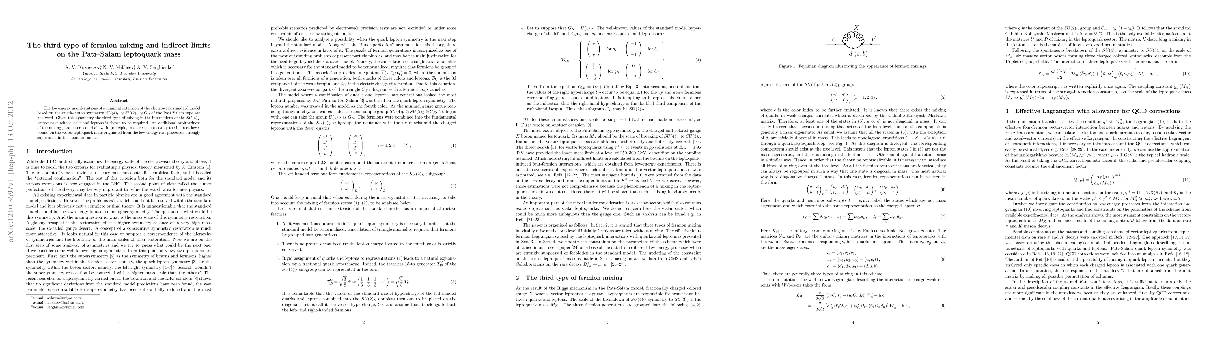 The low-energy manifestations of a minimal extension of the electroweak standard model based on the quark-lepton symmetry $SU(4)_V \otimes SU(2)_L \otimes G_R$ of the Pati-Salam type are analyzed. Given this symmetry the third type of mixing in the interactions of the $SU(4)_V$ leptoquarks with quarks and leptons is shown to be required. An additional arbitrariness of the mixing parameters could allow, in principle, to decrease noticeably the indirect lower bound on the vector leptoquark mass originated from the low-energy rare processes, strongly suppressed in the standard model.