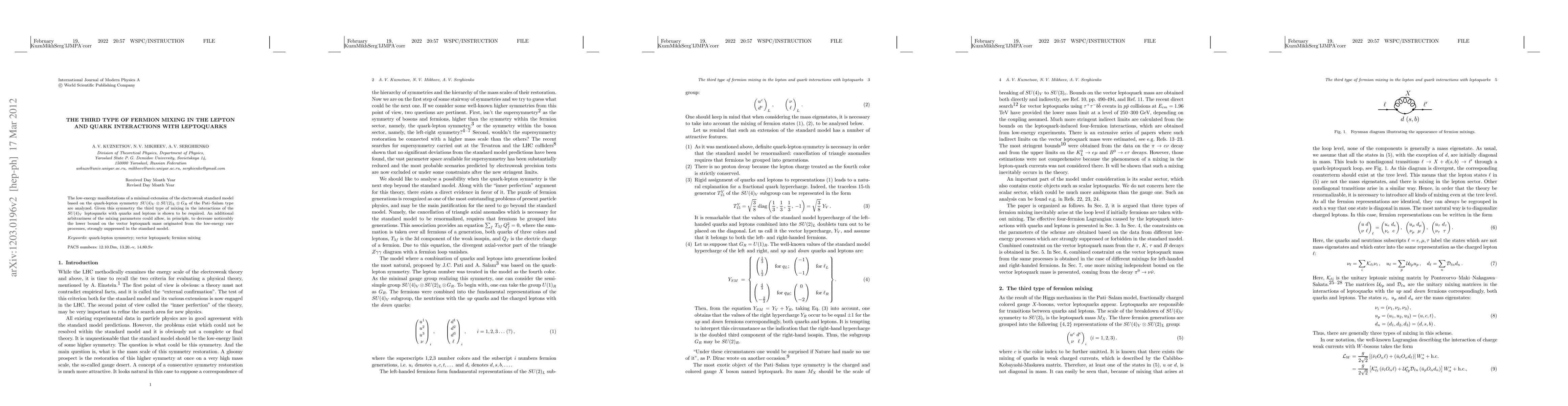 The low-energy manifestations of a minimal extension of the electroweak standard model based on the quark-lepton symmetry $SU(4)_V \otimes SU(2)_L \otimes G_R$ of the Pati--Salam type are analyzed. Given this symmetry the third type of mixing in the interactions of the $SU(4)_V$ leptoquarks with quarks and leptons is shown to be required. An additional arbitrariness of the mixing parameters could allow, in principle, to decrease noticeably the lower bound on the vector leptoquark mass originated from the low-energy rare processes, strongly suppressed in the standard model.