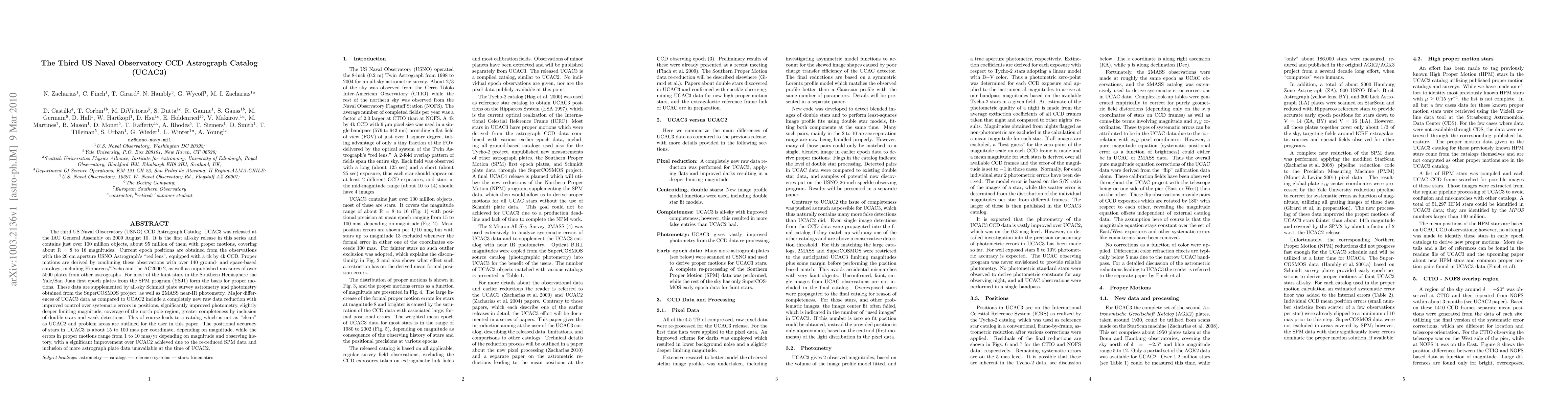The third US Naval Observatory (USNO) CCD Astrograph Catalog, UCAC3 was released at the IAU General Assembly on 2009 August 10. It is the first all-sky release in this series and contains just over 100 million objects, about 95 million of them with proper motions, covering about R = 8 to 16 magnitudes. Current epoch positions are obtained from the observations with the 20 cm aperture USNO Astrograph's "red lens", equipped with a 4k by 4k CCD. Proper motions are derived by combining these observations with over 140 ground- and space-based catalogs, including Hipparcos/Tycho and the AC2000.2, as well as unpublished measures of over 5000 plates from other astrographs. For most of the faint stars in the Southern Hemisphere the Yale/San Juan first epoch plates from the SPM program (YSJ1) form the basis for proper motions. These data are supplemented by all-sky Schmidt plate survey astrometry and photometry obtained from the SuperCOSMOS project, as well as 2MASS near-IR photometry. Major differences of UCAC3 data as compared to UCAC2 include a completely new raw data reduction with improved control over systematic errors in positions, significantly improved photometry, slightly deeper limiting magnitude, coverage of the north pole region, greater completeness by inclusion of double stars and weak detections. This of course leads to a catalog which is not as "clean" as UCAC2 and problem areas are outlined for the user in this paper. The positional accuracy of stars in UCAC3 is about 15 to 100 mas per coordinate, depending on magnitude, while the errors in proper motions range from 1 to 10 mas/yr depending on magnitude and observing history, with a significant improvement over UCAC2 achieved due to the re-reduced SPM data and inclusion of more astrograph plate data unavailable at the time of UCAC2.