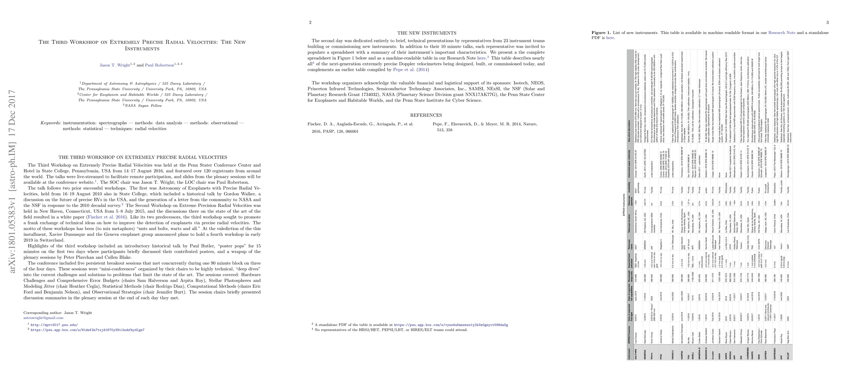 The Third Workshop on Extremely Precise Radial Velocities was held at the Penn Stater Conference Center and Hotel in State College, Pennsylvania, USA from 2016 August 14 to 17, and featured over 120 registrants from around the world. Here we provide a brief description of the conference, its format, and its session topics and chairs. 23 instrument teams were represented in plenary talks, and we present a table containing the basic characteristics of their new precise Doppler velocimeters.