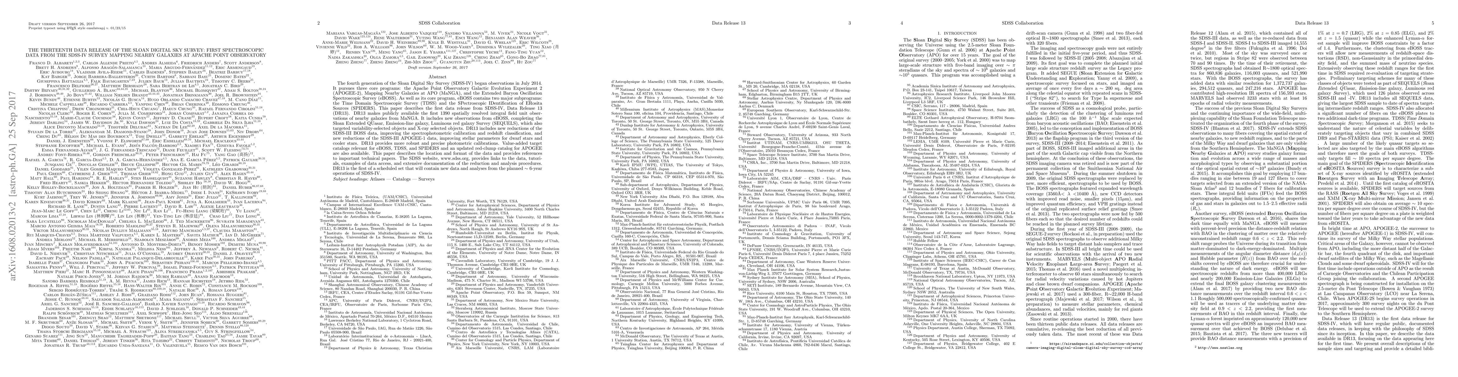 The Thirteenth Data Release (DR13) of the Sloan Digital Sky Survey (SDSS-IV) includes new spectroscopic data from MaNGA, eBOSS, and reanalyzed SDSS-III data, offering improved calibrations and new reductions for APOGEE-1 and BOSS. The release is publicly accessible via the SDSS website, accompanied by detailed documentation and tutorials.
