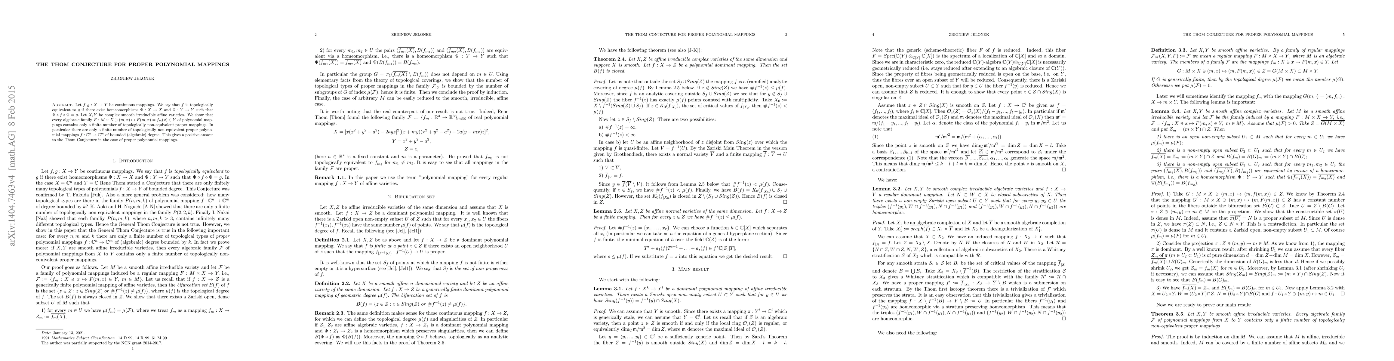 The paper establishes that any algebraic family of proper polynomial mappings between complex varieties contains only a finite number of topologically non-equivalent mappings, thus resolving the Thom Conjecture for this context. This result applies specifically to proper polynomial mappings from $\Bbb C^n$ to $\Bbb C^m$ of bounded degree.