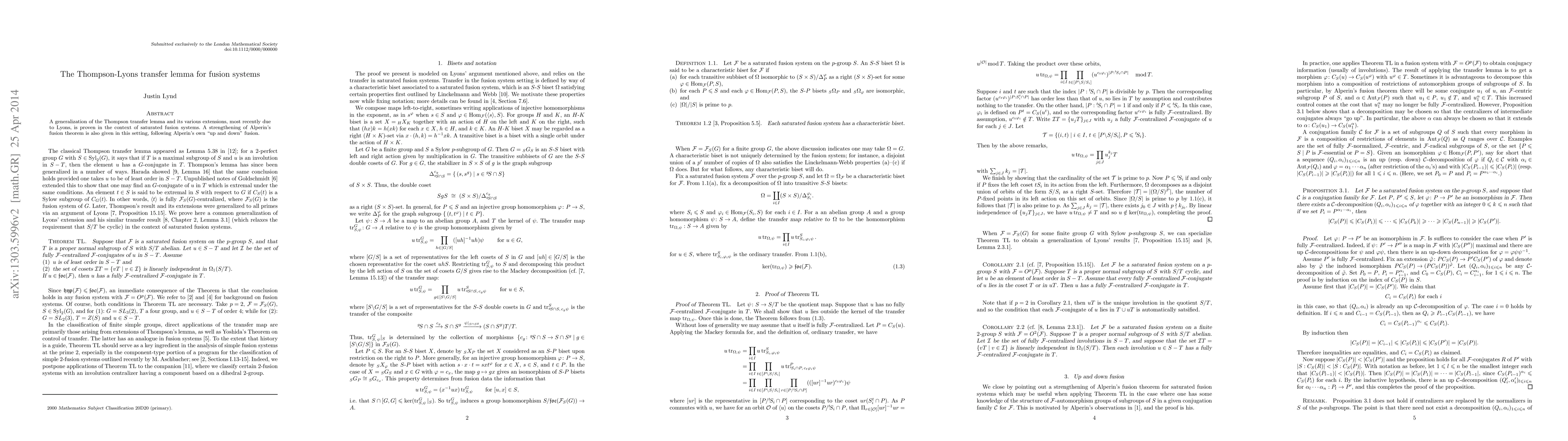 Summary: The paper generalizes the Thompson transfer lemma and Lyons' extensions to saturated fusion systems and provides a strengthened version of Alperin's fusion theorem within this context.
