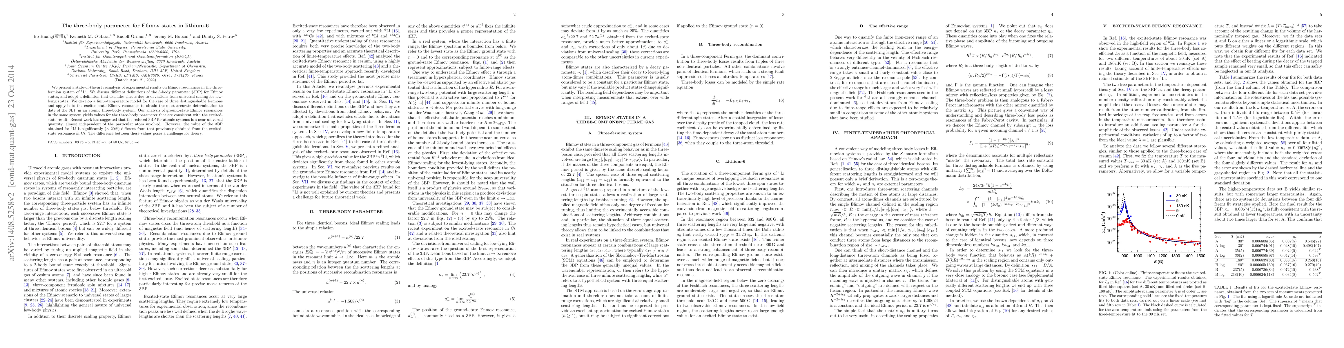 We present a state-of-the-art reanalysis of experimental results on Efimov resonances in the three-fermion system of $^6$Li. We discuss different definitions of the 3-body parameter (3BP) for Efimov states, and adopt a definition that excludes effects due to deviations from universal scaling for low-lying states. We develop a finite-temperature model for the case of three distinguishable fermions and apply it to the excited-state Efimov resonance to obtain the most accurate determination to date of the 3BP in an atomic three-body system. Our analysis of ground-state Efimov resonances in the same system yields values for the three-body parameter that are consistent with the excited-state result. Recent work has suggested that the reduced 3BP for atomic systems is a near-universal quantity, almost independent of the particular atom involved. However, the value of the 3BP obtained for $^6$Li is significantly ($\sim 20$%) different from that previously obtained from the excited-state resonance in Cs. The difference between these values poses a challenge for theory.