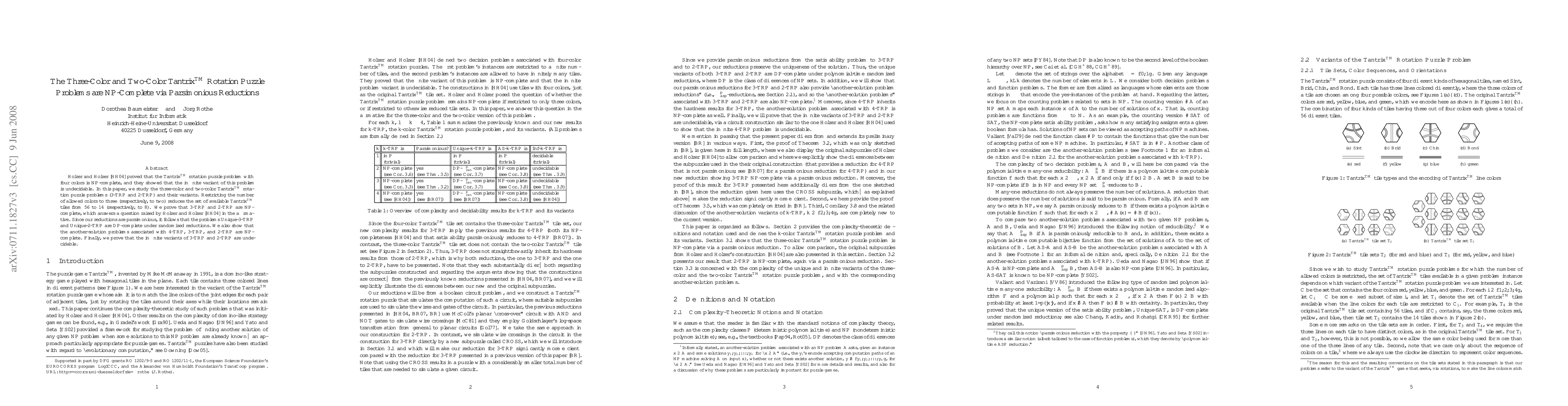 Holzer and Holzer (Discrete Applied Mathematics 144(3):345--358, 2004) proved that the Tantrix(TM) rotation puzzle problem with four colors is NP-complete, and they showed that the infinite variant of this problem is undecidable. In this paper, we study the three-color and two-color Tantrix(TM) rotation puzzle problems (3-TRP and 2-TRP) and their variants. Restricting the number of allowed colors to three (respectively, to two) reduces the set of available Tantrix(TM) tiles from 56 to 14 (respectively, to 8). We prove that 3-TRP and 2-TRP are NP-complete, which answers a question raised by Holzer and Holzer in the affirmative. Since our reductions are parsimonious, it follows that the problems Unique-3-TRP and Unique-2-TRP are DP-complete under randomized reductions. We also show that the another-solution problems associated with 4-TRP, 3-TRP, and 2-TRP are NP-complete. Finally, we prove that the infinite variants of 3-TRP and 2-TRP are undecidable.