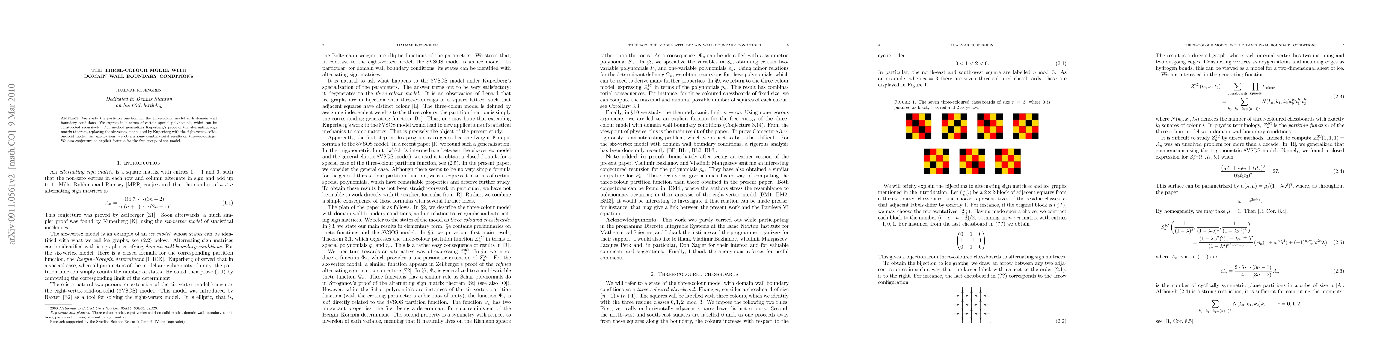This paper explores the partition function for the three-colour model with domain wall boundary conditions, expressing it using special recursive polynomials. It generalizes Kuperberg's proof by replacing the six-vertex model with the eight-vertex-solid-on-solid model, leading to combinatorial results on three-colourings and a conjectured explicit formula for the model's free energy.