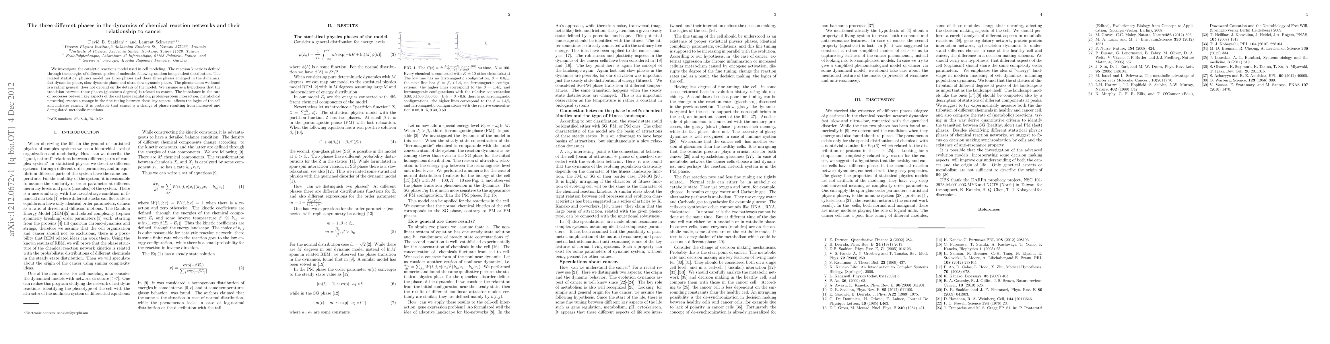 We investigate the catalytic reactions model used in cell modeling. The reaction kinetic is defined through the energies of different species of molecules following random independent distribution. The related statistical physics model has three phases and these three phases emerged in the dynamics: fast dynamics phase, slow dynamic phase and ultra-slow dynamic phase. The phenomenon we found is a rather general, does not depend on the details of the model. We assume as a hypothesis that the transition between these phases (glassiness degrees) is related to cancer. The imbalance in the rate of processes between key aspects of the cell (gene regulation, protein-protein interaction, metabolical networks) creates a change in the fine tuning between these key aspects, affects the logics of the cell and initiates cancer. It is probable that cancer is a change of phase resulting from increased and deregulated metabolic reactions.