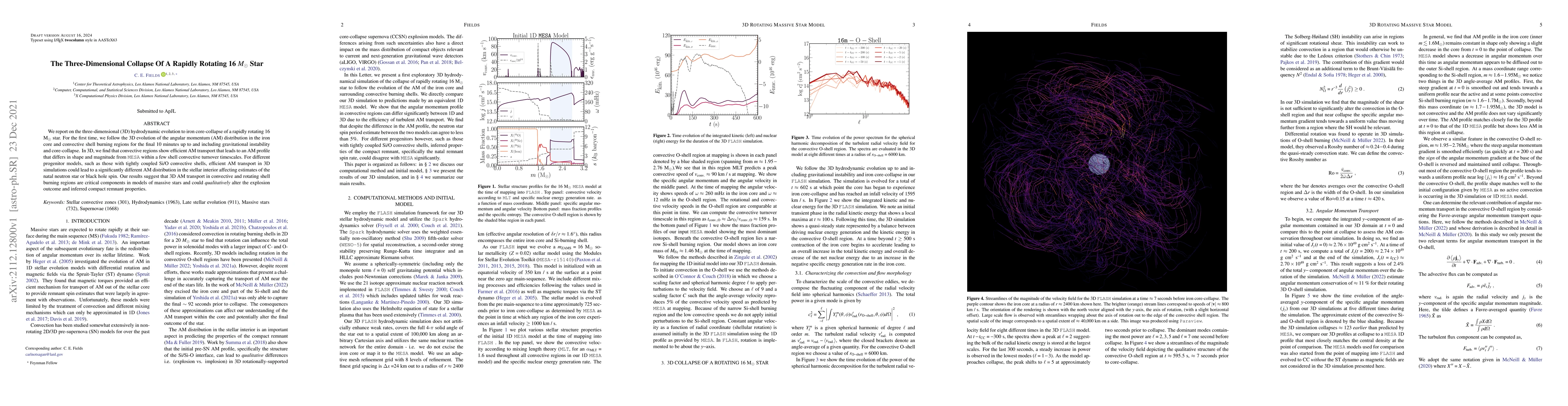 This paper investigates the three-dimensional hydrodynamic evolution of a rapidly rotating 16 $M_{\odot}$ star leading to core-collapse, highlighting the impact of angular momentum transport in convective regions. The study finds that three-dimensional simulations significantly alter angular momentum profiles compared to 1D models, potentially affecting the spin of neutron stars or black holes and the outcomes of supernova explosions.