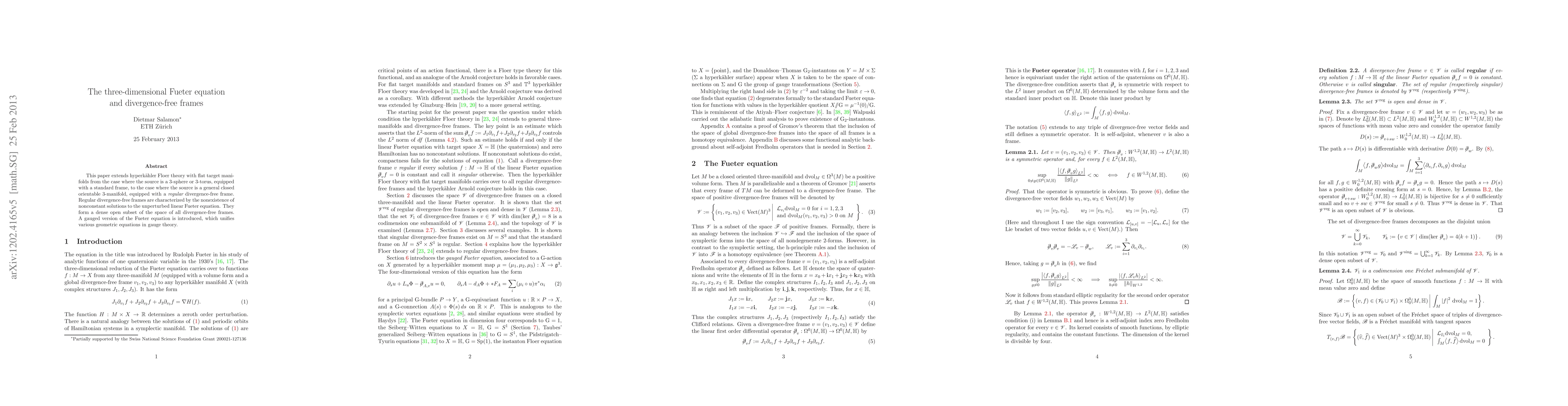 A divergence free frame on a closed three manifold is called regular if every solution of the linear Fueter equation is constant and is called singular otherwise. The set of singular divergence free frames is an analogue of the Maslov cycle. Regular divergence free frames satisfy an analogue of the Arnold conjecture for flat hyperkaehler target manifolds. The Seiberg-Witten equations can be viewed as gauged versions of the Fueter equation, and so can the Donaldson-Thomas equations on certain seven dimensional product manifolds.