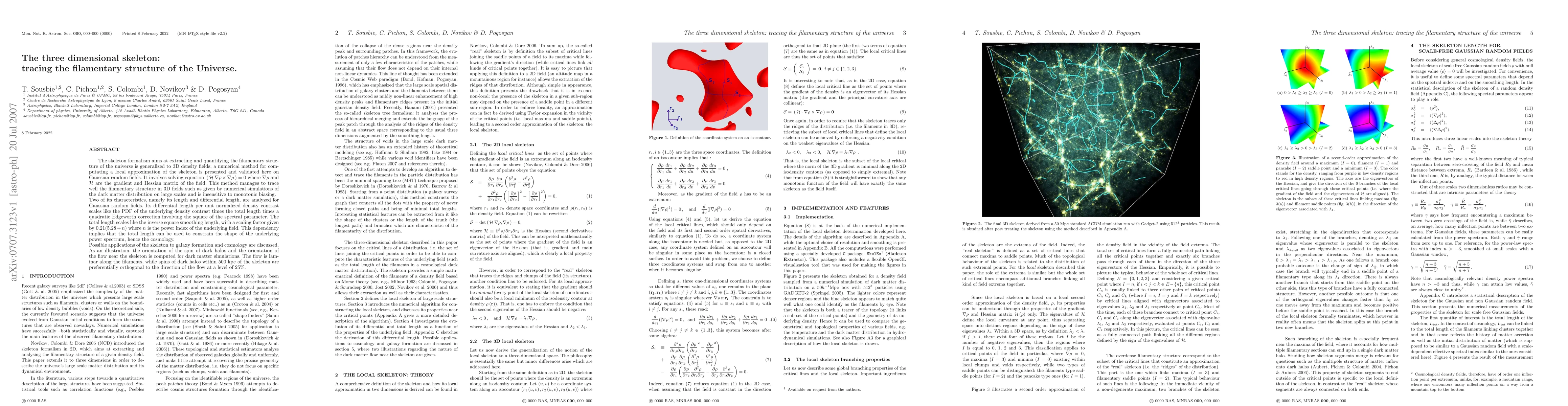 Researchers develop a method to analyze 3D structures in the universe, finding that the skeleton of these structures can be used to constrain cosmology models, with characteristics like length and differential length scaling with underlying density contrast.