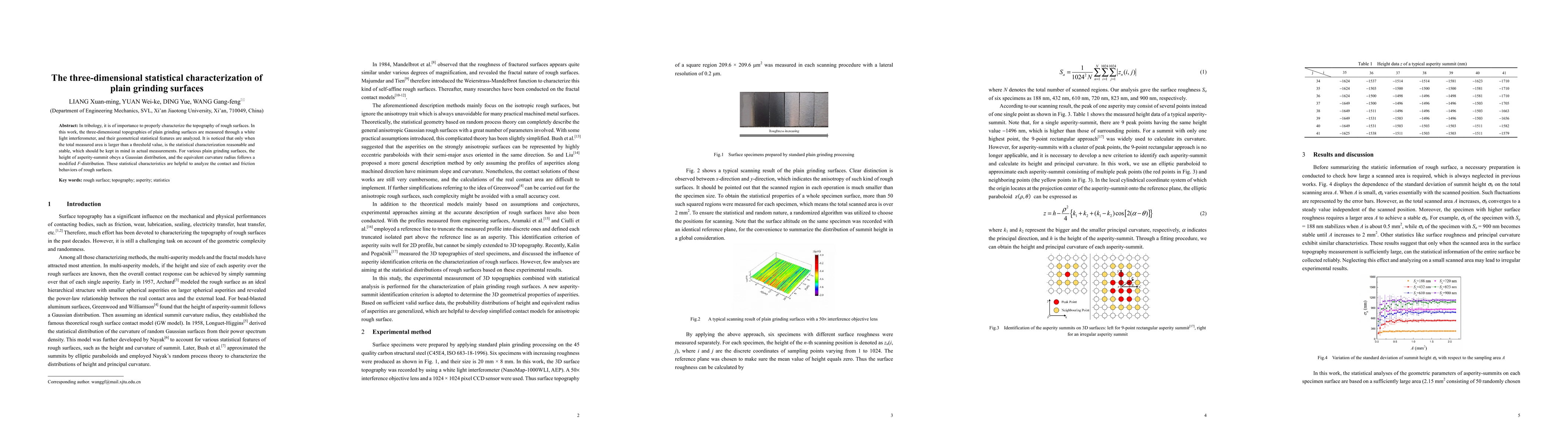 This study uses a white light interferometer to measure 3D topographies of ground surfaces, finding that for accurate statistical characterization, the measured area must exceed a certain threshold. The height of asperity peaks follows a Gaussian distribution, and the equivalent curvature radius aligns with a modified F-distribution, aiding in understanding contact and friction behavior of rough surfaces.