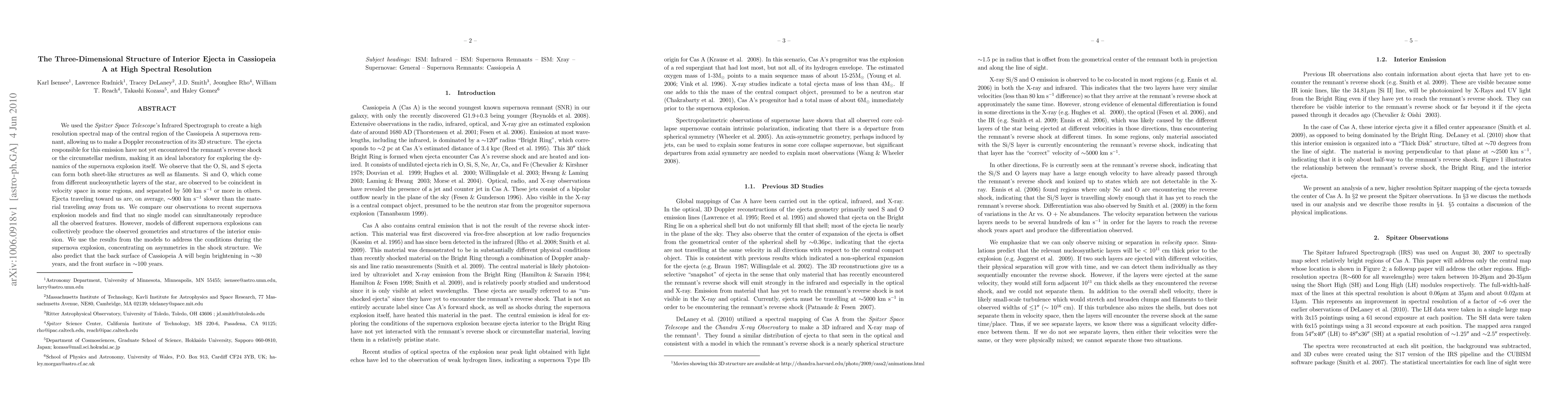 This study uses Spitzer Space Telescope data to reconstruct the 3D structure of the Cassiopeia A supernova remnant's interior ejecta, revealing sheet-like and filamentary formations. The findings indicate asymmetries in ejecta velocities and suggest that no single model can fully explain the observed features, but a combination of models can.