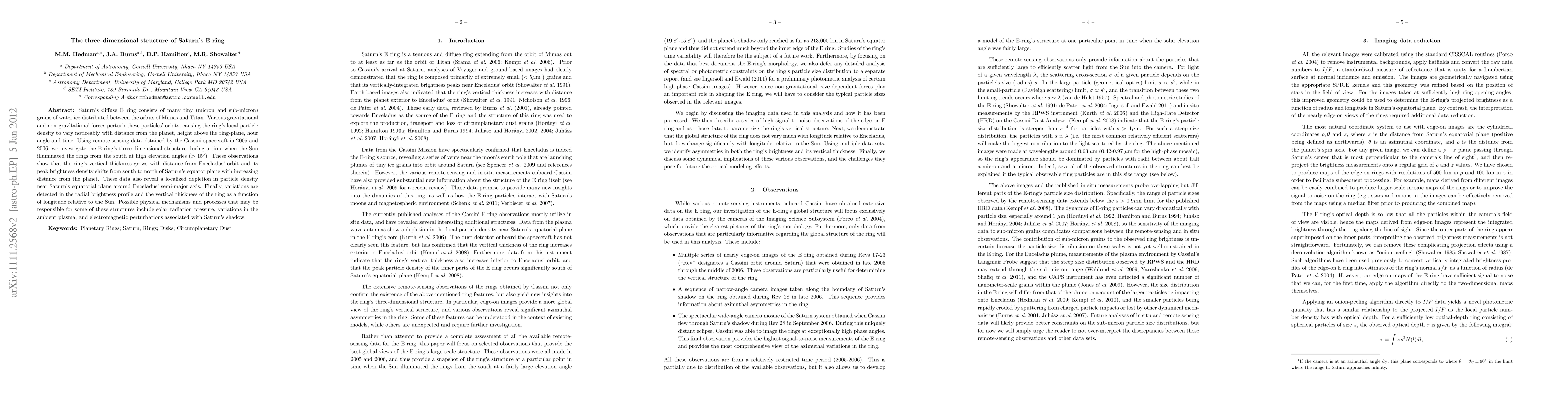 Research on Saturn's E ring reveals its three-dimensional structure varies with distance from Saturn, height above the plane, and time of day, influenced by solar radiation pressure and magnetic perturbations.