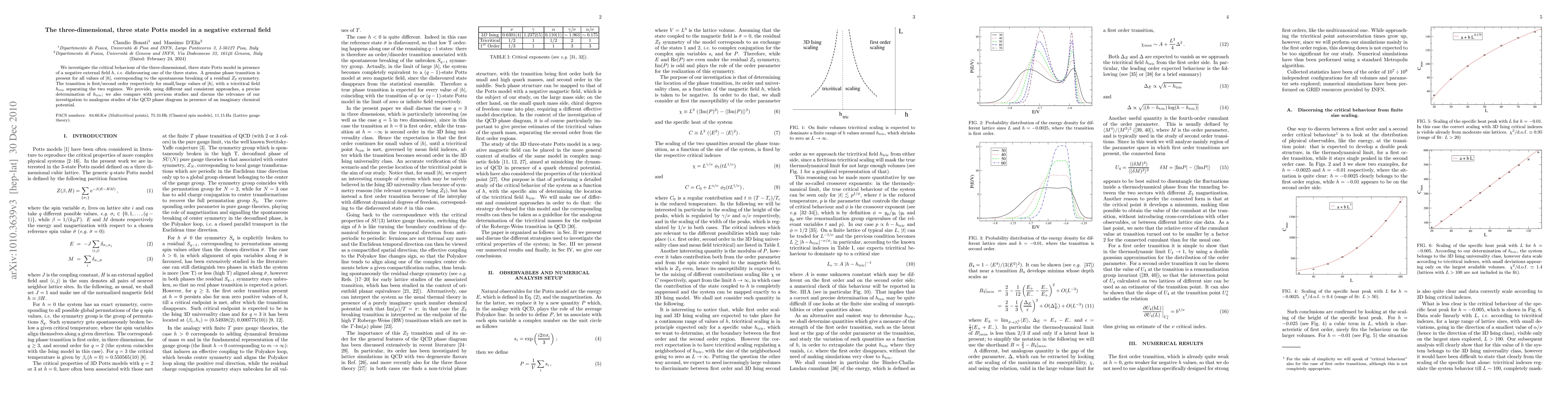 This paper examines the critical behavior of the three-dimensional, three-state Potts model under a negative external field, revealing a phase transition for all field strengths. The transition is first/second order for small/large field values, separated by a tricritical field, and the study provides precise determination of this tricritical field, relevant to QCD phase diagram studies.