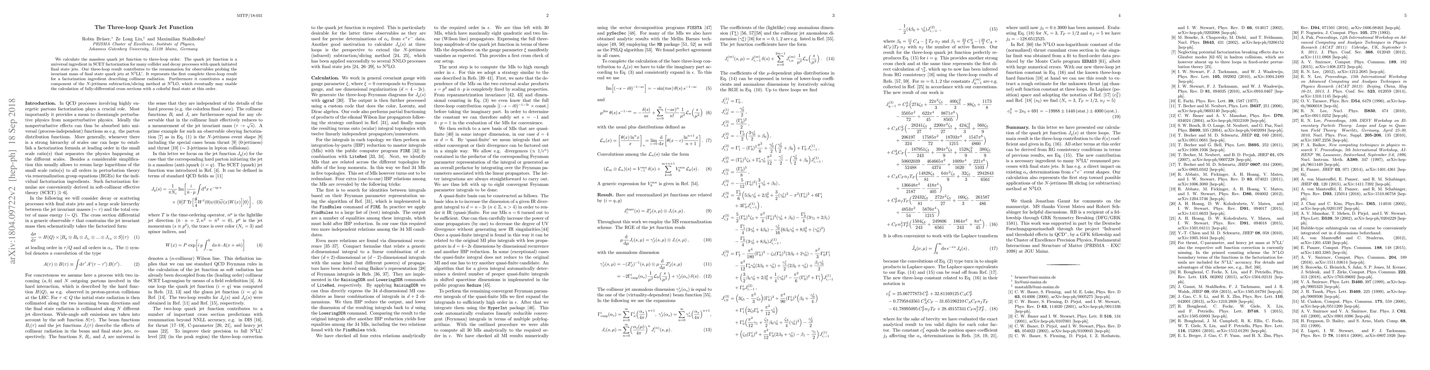 We calculate the massless quark jet function to three-loop order. The quark jet function is a universal ingredient in SCET factorization for many collider and decay processes with quark initiated final state jets. Our three-loop result contributes to the resummation for observables probing the invariant mass of final state quark jets at N$^3$LL$^\prime$. It represents the first complete three-loop result for a factorization ingredient describing collinear radiation. Furthermore it constitutes a major component of the $N$-jettiness subtraction/slicing method at N$^3$LO, which eventually may enable the calculation of fully-differential cross sections with a colorful final state at this order.