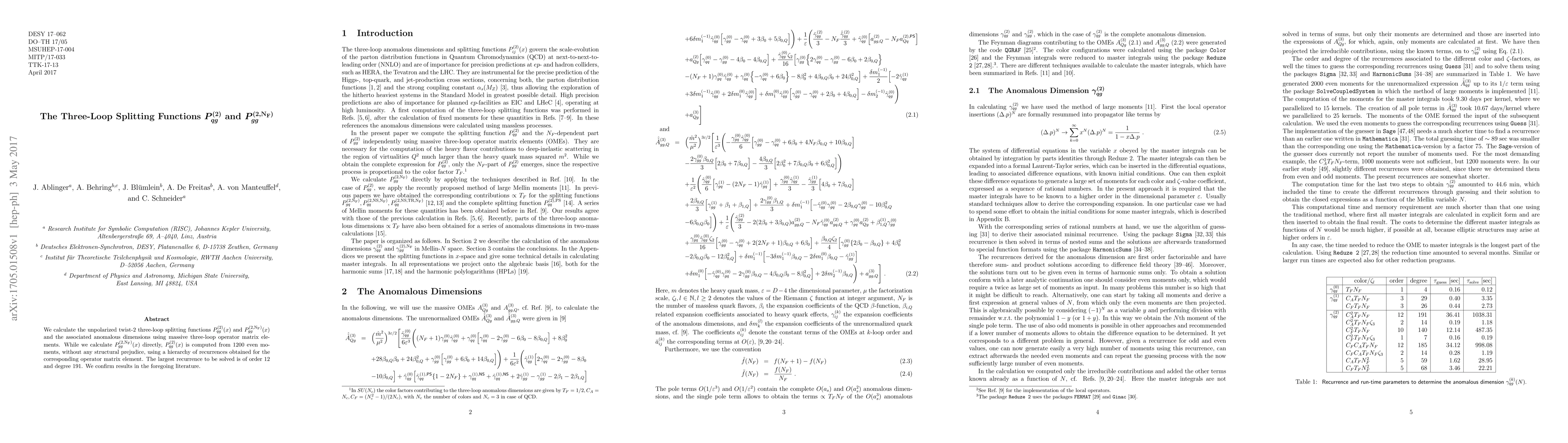 This paper calculates the three-loop splitting functions $P_{qg}^{(2)}(x)$ and $P_{gg}^{(2,\rm N_F)}(x)$ and their anomalous dimensions using massive three-loop operator matrix elements. The function $P_{qg}^{(2)}(x)$ is derived from 1200 even moments through a hierarchy of recurrences.