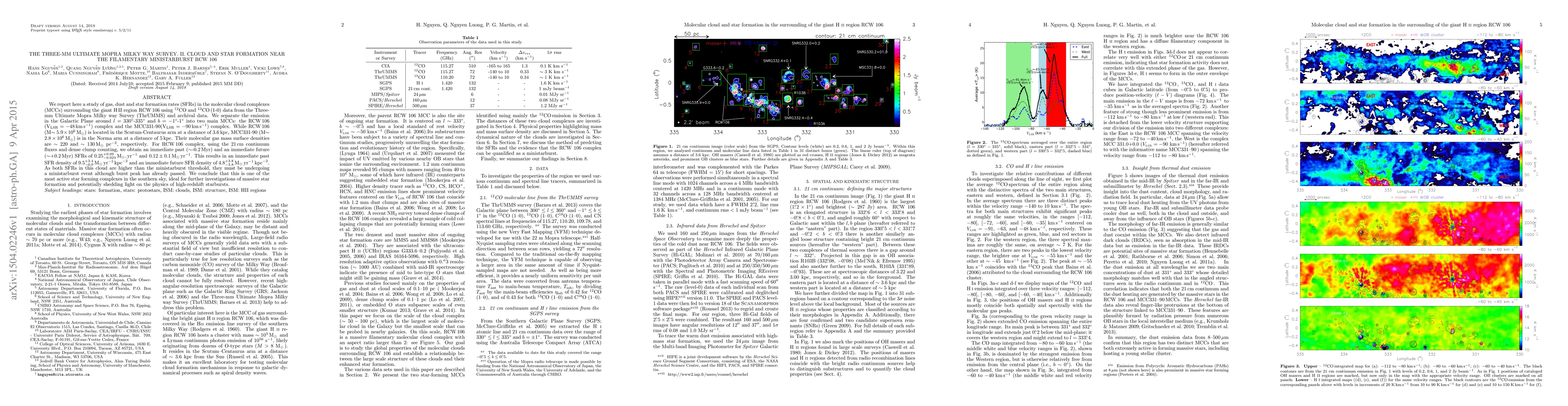 We report here a study of gas, dust and star formation rates (SFRs) in the molecular cloud complexes (MCCs) surrounding the giant H$\,{\rm \scriptsize{II}}$ region RCW$\,$106 using $^{12}$CO and $^{13}$CO$\,$(1-0) data from the Three-mm Ultimate Mopra Milky way Survey (ThrUMMS) and archival data. We separate the emission in the Galactic Plane around $l=330^{\circ}$-$335^{\circ}$ and $b=-1^{\circ}$-$1^{\circ}$ into two main MCCs: the RCW$\,$106 (V$_{\rm LSR} = -48\,$km$\,$s$^{-1}$) complex and the MCC331-90(V$_{\rm LSR} = -90\,$km$\,$s$^{-1}$) complex. While RCW$\,$106 (M$\sim 5.9\times 10^{6}\,$M$_{\odot}$) is located in the Scutum-Centaurus arm at a distance of 3.6$\,$kpc, MCC331-90 (M$\sim 2.8\times 10^{6}\,$M$_{\odot}$) is in the Norma arm at a distance of 5$\,$kpc. Their molecular gas mass surface densities are $\sim220$ and $\sim130\,$M$_{\odot}$ pc$^{-2}$, respectively. For RCW$\,$106 complex, using the 21$\,$cm continuum fluxes and dense clump counting, we obtain an immediate past ($\sim$-0.2$\,$Myr) and an immediate future ($\sim$+0.2$\,$Myr) SFRs of $0.25_{-0.023}^{+0.09}\,$M$_{\odot},{\rm yr}^{-1}$ and $0.12\pm0.1 \,$M$_{\odot}\,{\rm yr}^{-1}$. This results in an immediate past SFR density of $9.5_{-0.9}^{+3.4}\,$M$_{\odot}\,{\rm yr}^{-1}\,{\rm kpc}^{-2}$ and an immediate future SFR density of $4.8_{-3.8}^{+3.8}\,$M$_{\odot}\,{\rm yr}^{-1}\,{\rm kpc}^{-2}$. As both SFRs in this cloud are higher than the ministarburst threshold, they must be undergoing a ministarburst event although burst peak has already passed. We conclude that this is one of the most active star forming complexes in the southern sky, ideal for further investigations of massive star formation and potentially shedding light on the physics of high-redshift starbursts.