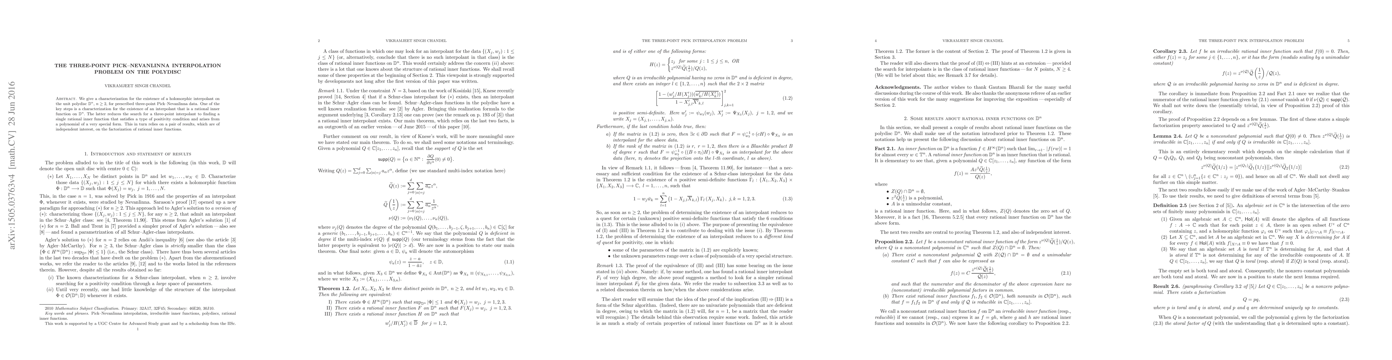 We give a characterization for the existence of a holomorphic interpolant on the unit polydisc $\mathbb{D}^n,$ $n\geq 2,$ for prescribed three-point Pick--Nevanlinna data. One of the key steps is a characterization for the existence of an interpolant that is a rational inner function on $\mathbb{D}^n.$ The latter reduces the search for a three-point interpolant to finding a single rational inner function that satisfies a type of positivity condition and arises from a polynomial of a very special form. This in turn relies on a pair of results, which are of independent interest, on the factorization of rational inner functions.