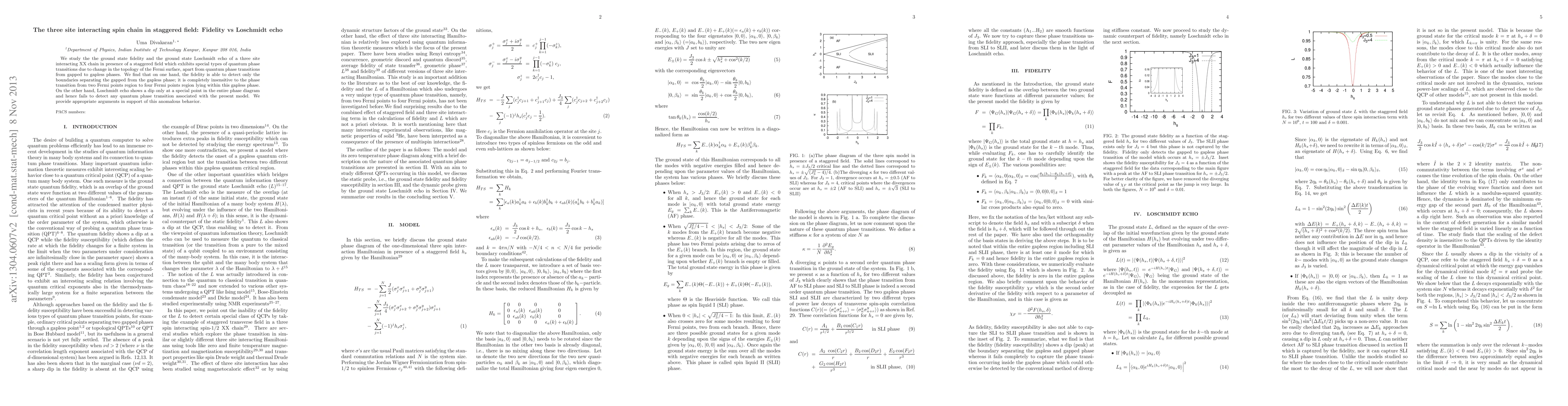 This paper investigates the ground state fidelity and Loschmidt echo for a three-site interacting spin chain in a staggered field, revealing distinct sensitivities to different quantum phase transitions. The fidelity detects phase transitions between gapped and gapless phases but not within the gapless phase, while the Loschmidt echo only shows a dip at a specific point, failing to detect other transitions.