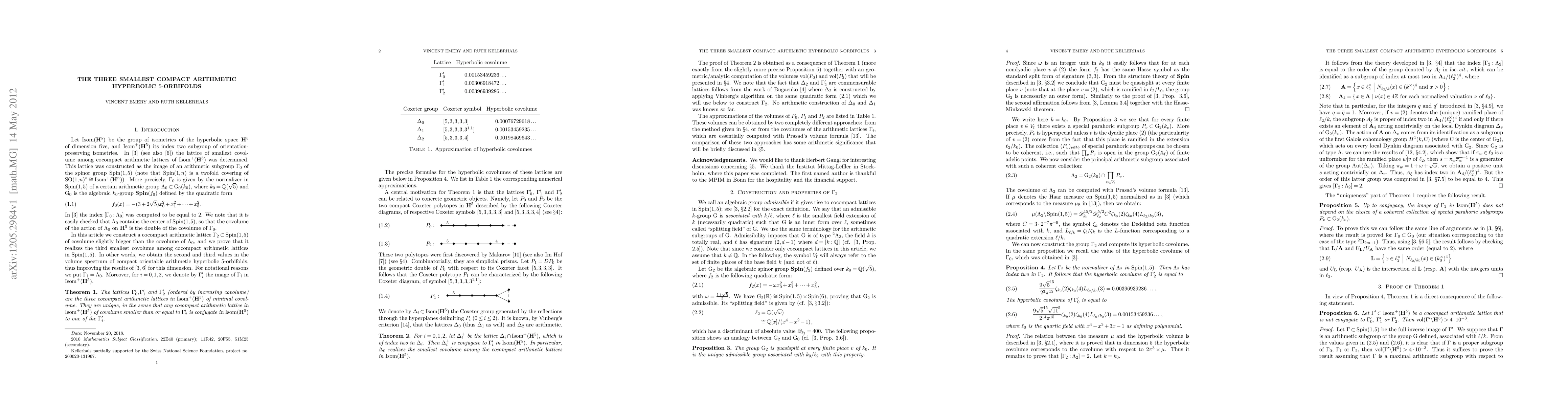 This paper identifies the three smallest volume compact arithmetic hyperbolic 5-orbifolds and determines their fundamental groups as hyperbolic Coxeter groups, providing two methods for computing their volumes.