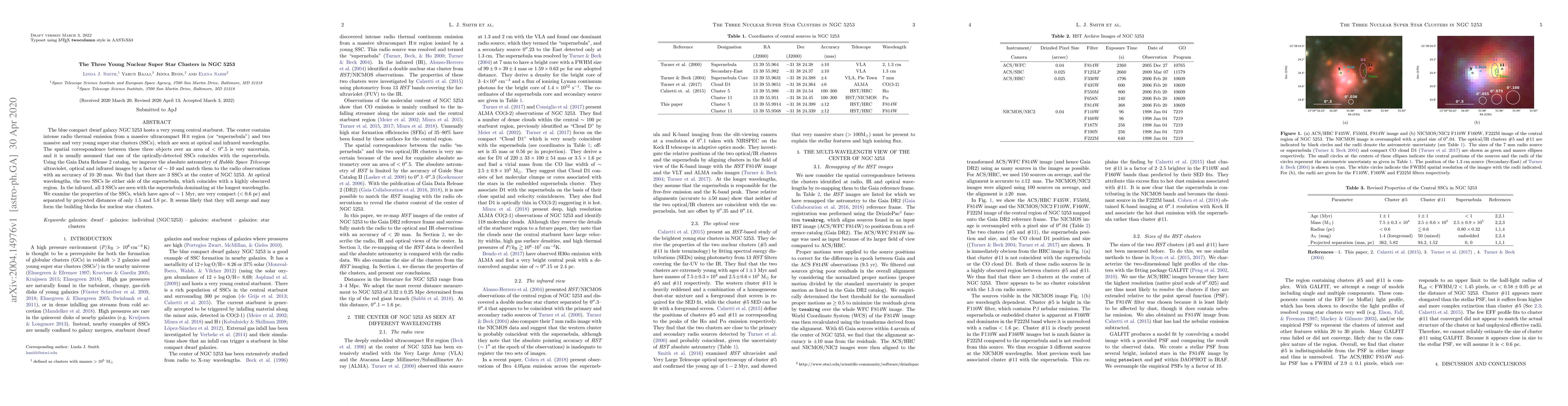 The blue compact dwarf galaxy NGC 5253 hosts a very young central starburst. The center contains intense radio thermal emission from a massive ultracompact H II region (or "supernebula") and two massive and very young super star clusters (SSCs), which are seen at optical and infrared wavelengths. The spatial correspondence between these three objects over an area of < 0.5 arcsec is very uncertain, and it is usually assumed that one of the optically-detected SSCs coincides with the supernebula. Using the Gaia Data Release 2 catalog, we improve the absolute astrometry of Hubble Space Telescope ultraviolet, optical and infrared images by a factor of ~10 and match them to the radio observations with an accuracy of 10-20 mas. We find that there are 3 SSCs at the center of NGC 5253. At optical wavelengths, the two SSCs lie either side of the supernebula, which coincides with a highly obscured region. In the infrared, all 3 SSCs are seen with the supernebula dominating at the longest wavelengths. We examine the properties of the SSCs, which have ages of ~ 1 Myr, are very compact (<0.6 pc) and separated by projected distances of only 1.5 and 5.8 pc. It seems likely that they will merge and may form the building blocks for nuclear star clusters.