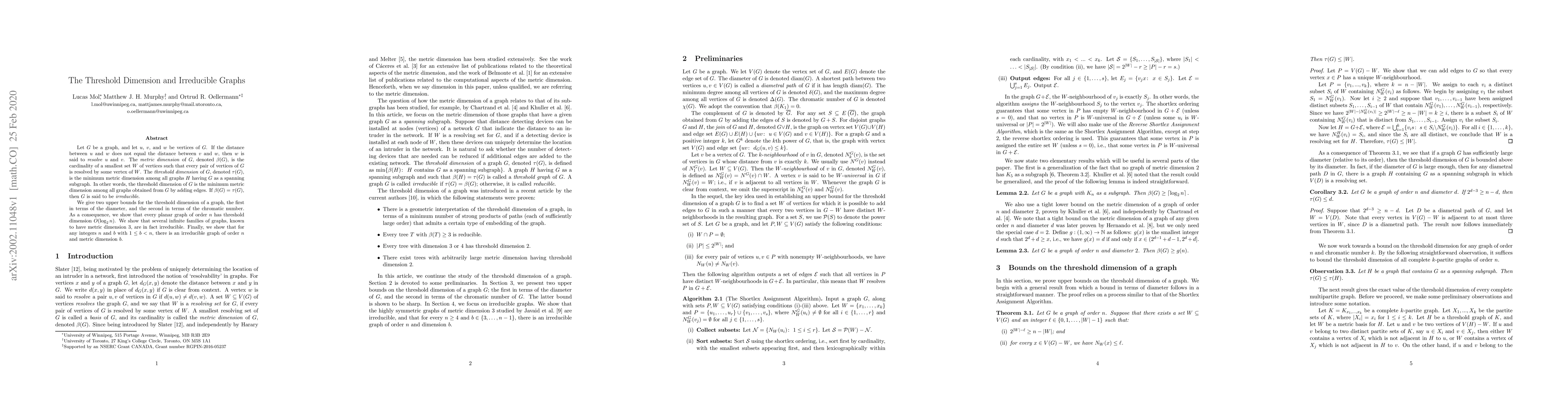 Let $G$ be a graph, and let $u$, $v$, and $w$ be vertices of $G$. If the distance between $u$ and $w$ does not equal the distance between $v$ and $w$, then $w$ is said to resolve $u$ and $v$. The metric dimension of $G$, denoted $\beta(G)$, is the cardinality of a smallest set $W$ of vertices such that every pair of vertices of $G$ is resolved by some vertex of $W$. The threshold dimension of $G$, denoted $\tau(G)$, is the minimum metric dimension among all graphs $H$ having $G$ as a spanning subgraph. In other words, the threshold dimension of $G$ is the minimum metric dimension among all graphs obtained from $G$ by adding edges. If $\beta(G) = \tau(G)$, then $G$ is said to be irreducible. We give two upper bounds for the threshold dimension of a graph, the first in terms of the diameter, and the second in terms of the chromatic number. As a consequence, we show that every planar graph of order $n$ has threshold dimension $O (\log_2 n)$. We show that several infinite families of graphs, known to have metric dimension $3$, are in fact irreducible. Finally, we show that for any integers $n$ and $b$ with $1 \leq b < n$, there is an irreducible graph of order $n$ and metric dimension $b$.