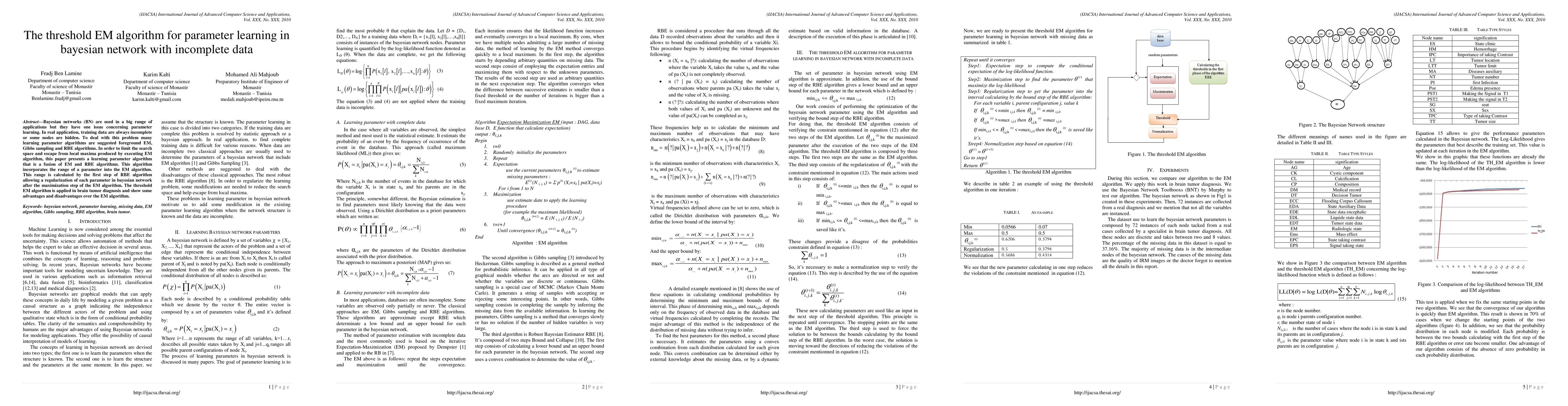 This paper introduces a threshold EM algorithm for parameter learning in Bayesian networks with incomplete data, combining EM and RBE algorithms to limit the search space and improve convergence. The proposed method is tested in brain tumor diagnosis, demonstrating both advantages and disadvantages compared to traditional EM algorithms.