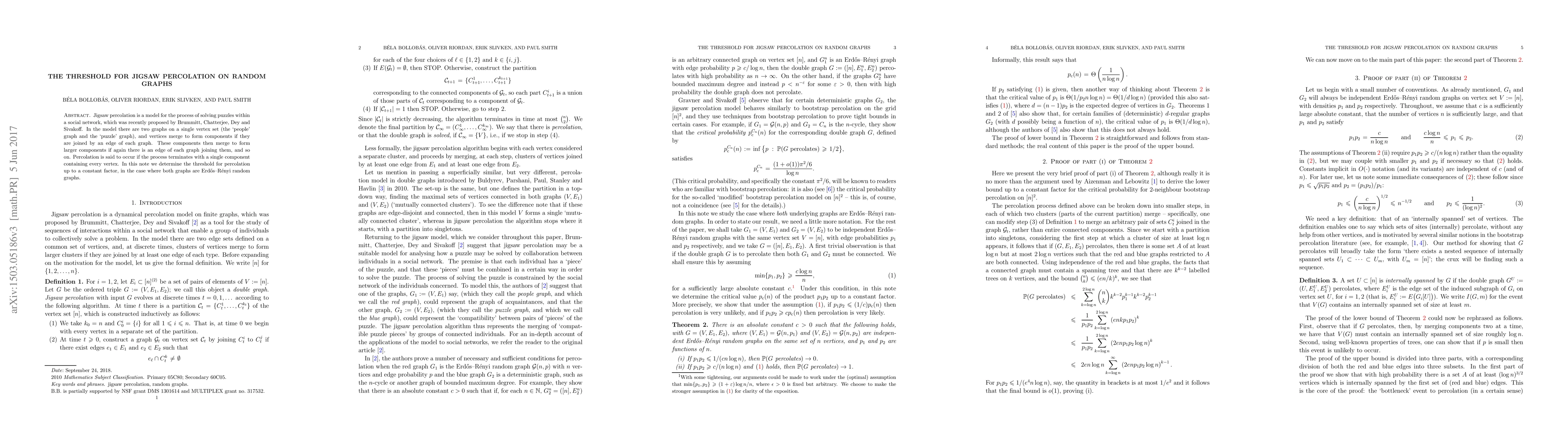 A combination of Monte Carlo simulations and analytical methods were used to study the jigsaw percolation model.